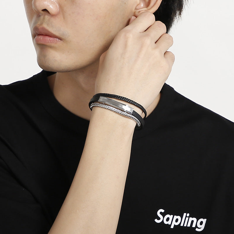 Discover the Planderful European and American fashionable men's leather bracelet from the Everyday Genie collection. This personalized and creative multi-layer design blends rugged leather rope with a sleek stainless steel chain, finished with a magnetic buckle for effortless, secure wear.