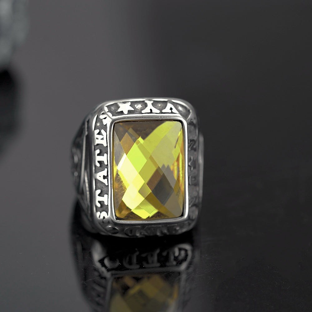 Discover the perfect blend of style and durability with our European and American jewelry wholesale men's titanium steel ring retro hip-hop stainless steel yellow stone ring for men. This exceptional ring, crafted from high-quality titanium steel, boasts a striking design that reflects the essence of modern masculinity.