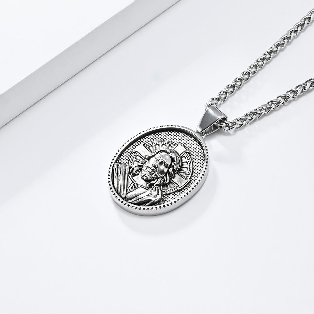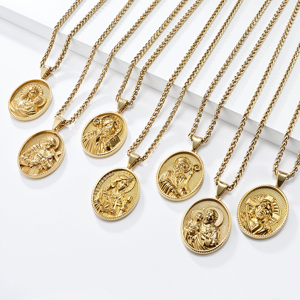 Introducing the European and American Virgin Mary Titanium Steel Pendant – a meaningful accessory that celebrates faith and family. Featuring the revered figures of the Virgin Mary and Father and Son Jesus, along with the protective St. Benedict, this pendant is more than just a piece of jewelry; it’s a statement of belief and a symbol of strength.