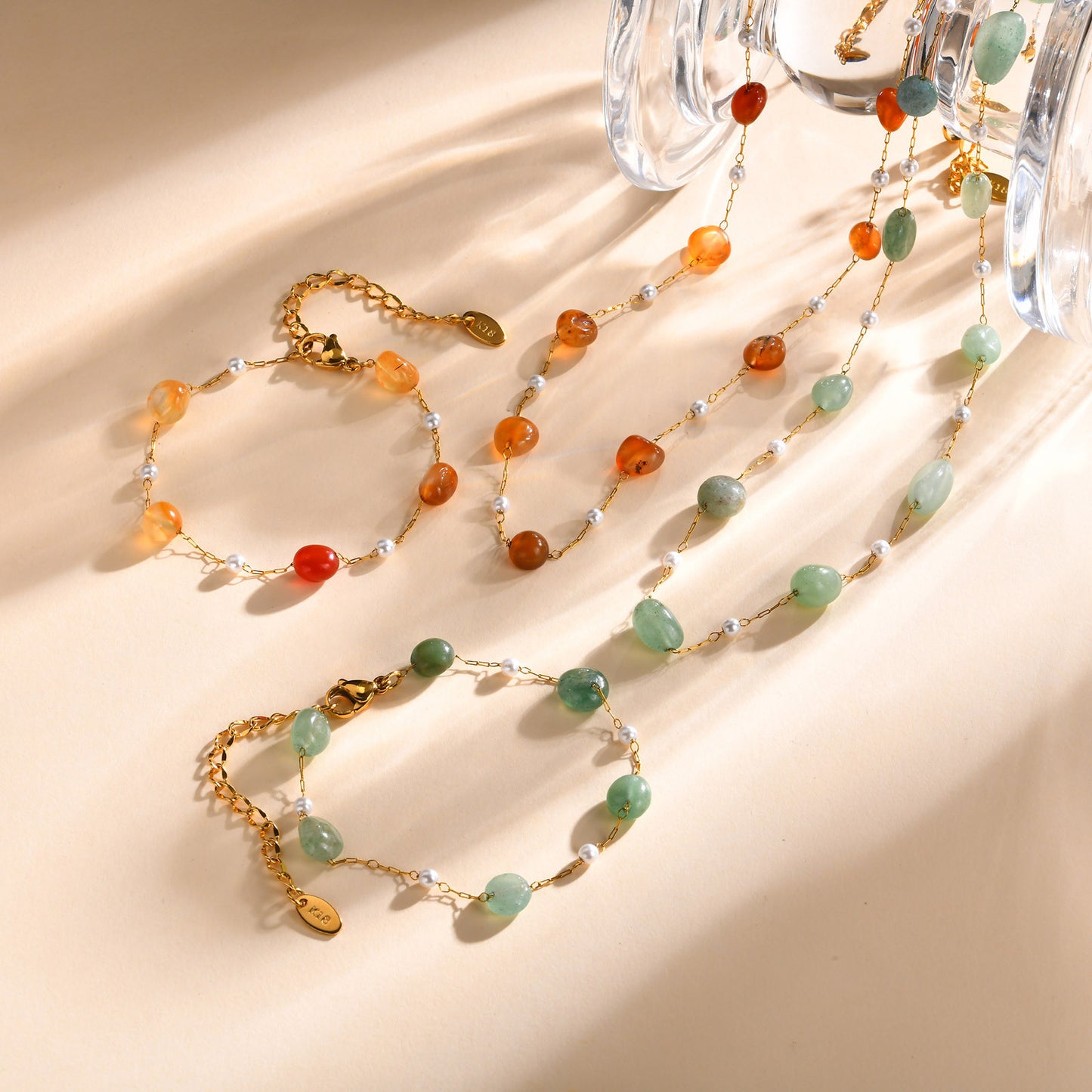 Discover the exquisite elegance of the European and American Women's Children's Stainless Steel Chain Imitation Jade Imitation Amber Imitation Pearl Bracelet Necklace Set Gold Fashion. This stunning jewelry set combines timeless beauty with modern design, making it the perfect accessory for any occasion. Crafted with high-quality stainless steel, the pieces ensure durability while maintaining a luxurious look.