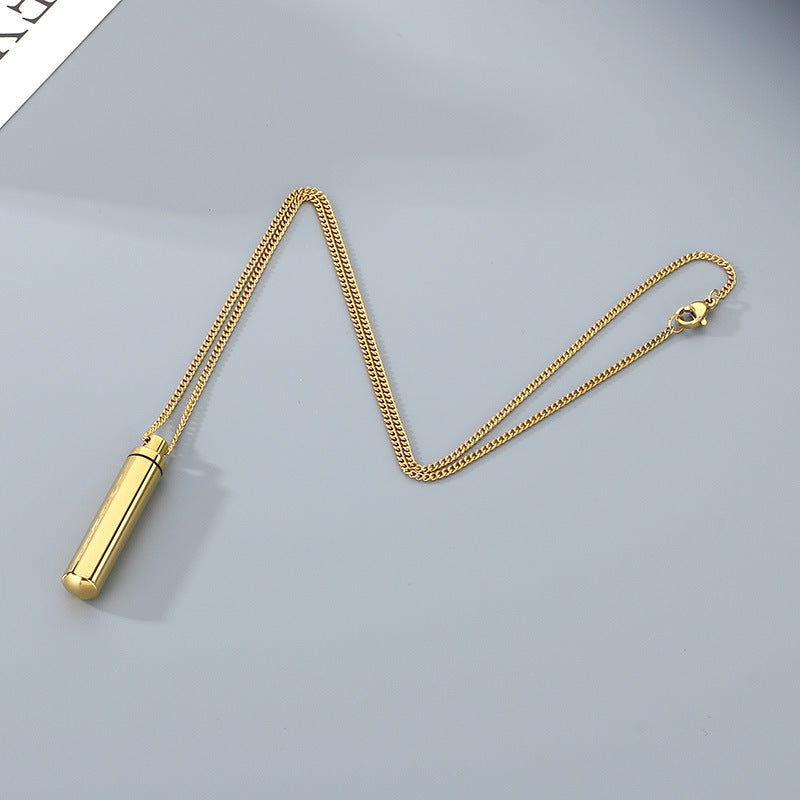 Discover the Planderful cylindrical commemorative pendant—a unisex stainless steel necklace that blends bold design with a playful, perfume bottle feature. Part of the Everyday Genie collection, this piece is crafted for both men and women and channels cosmopolitan European and American-inspired style.