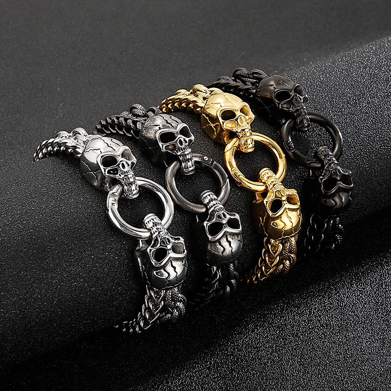 Embrace a bold style statement with the European and American domineering fashion punk style double-layer skull titanium steel bracelet. Elevate your accessory game with this edgy piece designed for the modern man.