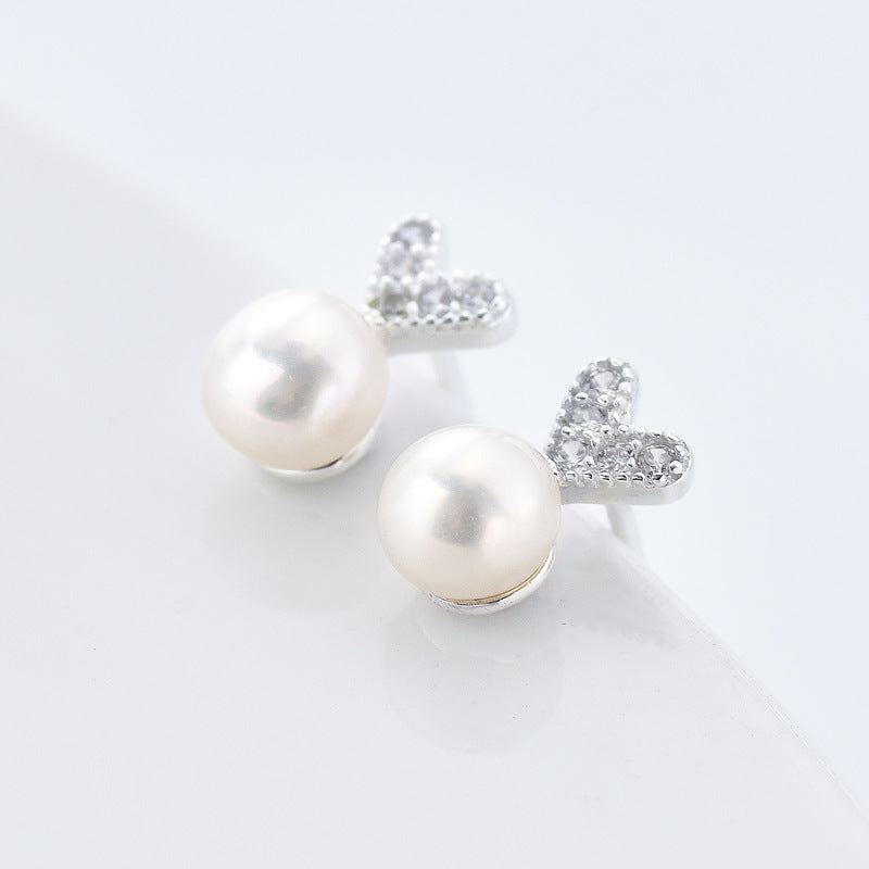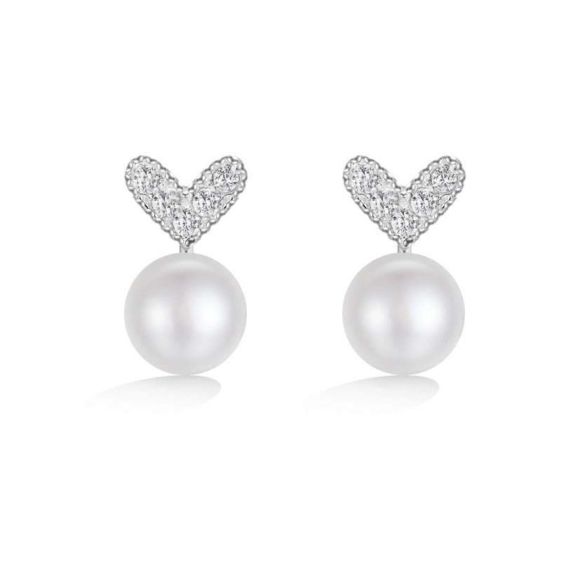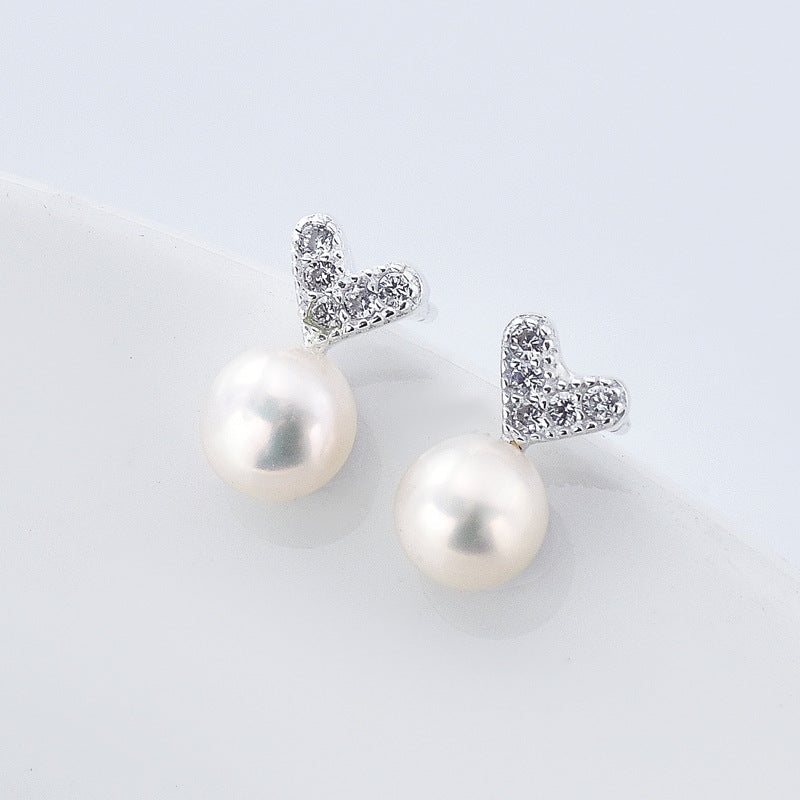 Zircon Heart with Freshwater Pearl Silver Stud Earrings for Women