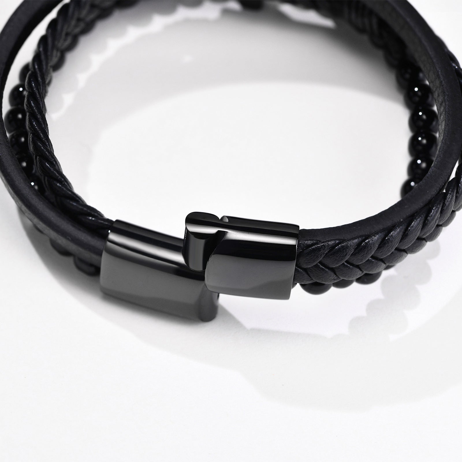 Men's Stainless Steel Cross Black Agate Leather Bracelet