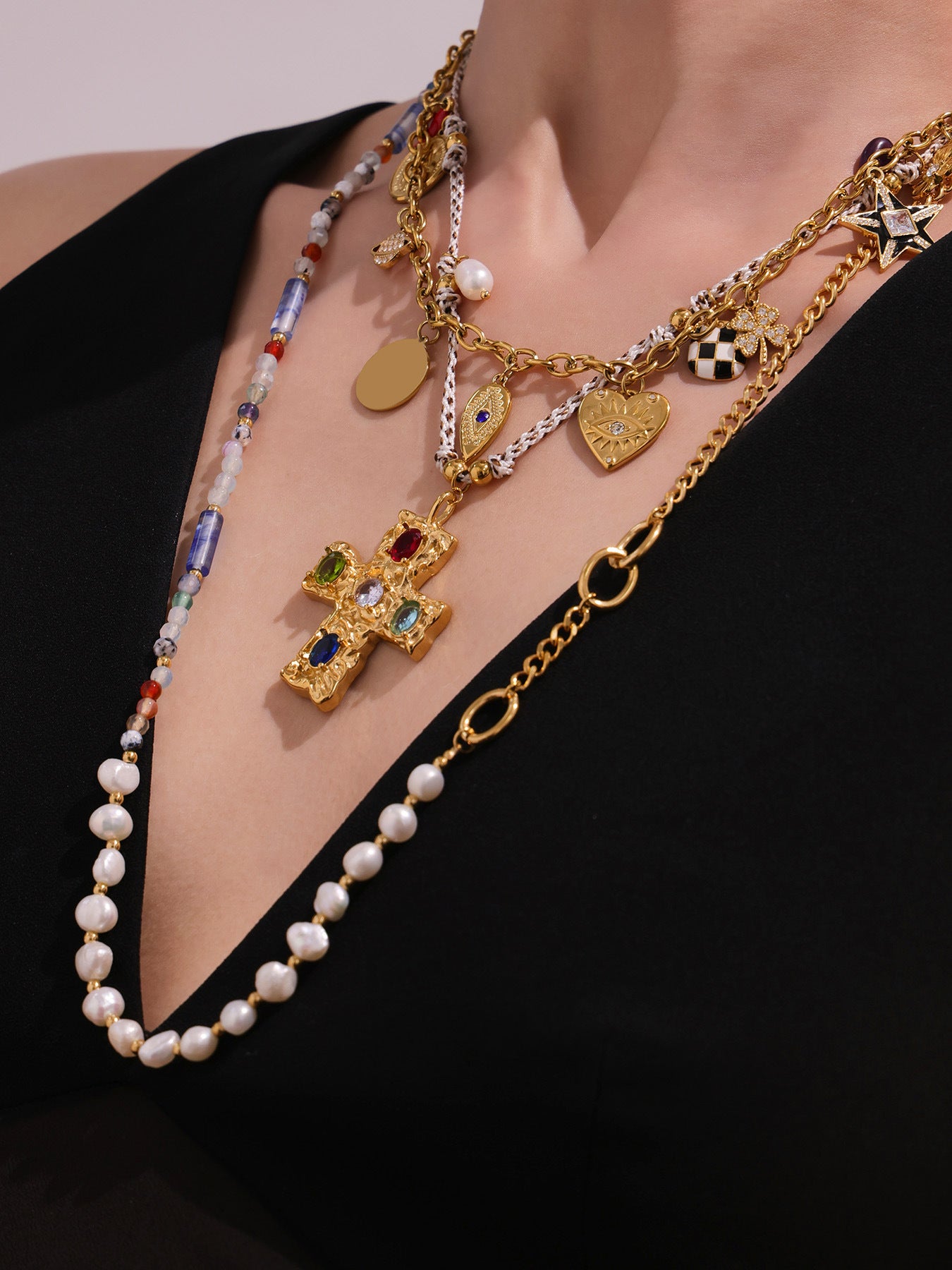 Elevate your everyday look with the Planderful Everyday Genie collection's Natural Freshwater Pearl & Natural Stone Cross Necklace. This elegant piece combines a luminous natural freshwater pearl with semi-precious natural stones, centered on a long sweater chain in a durable metal setting. The zircon-accented cross adds a touch of sparkle, making it versatile for both casual and dressed-up outfits.