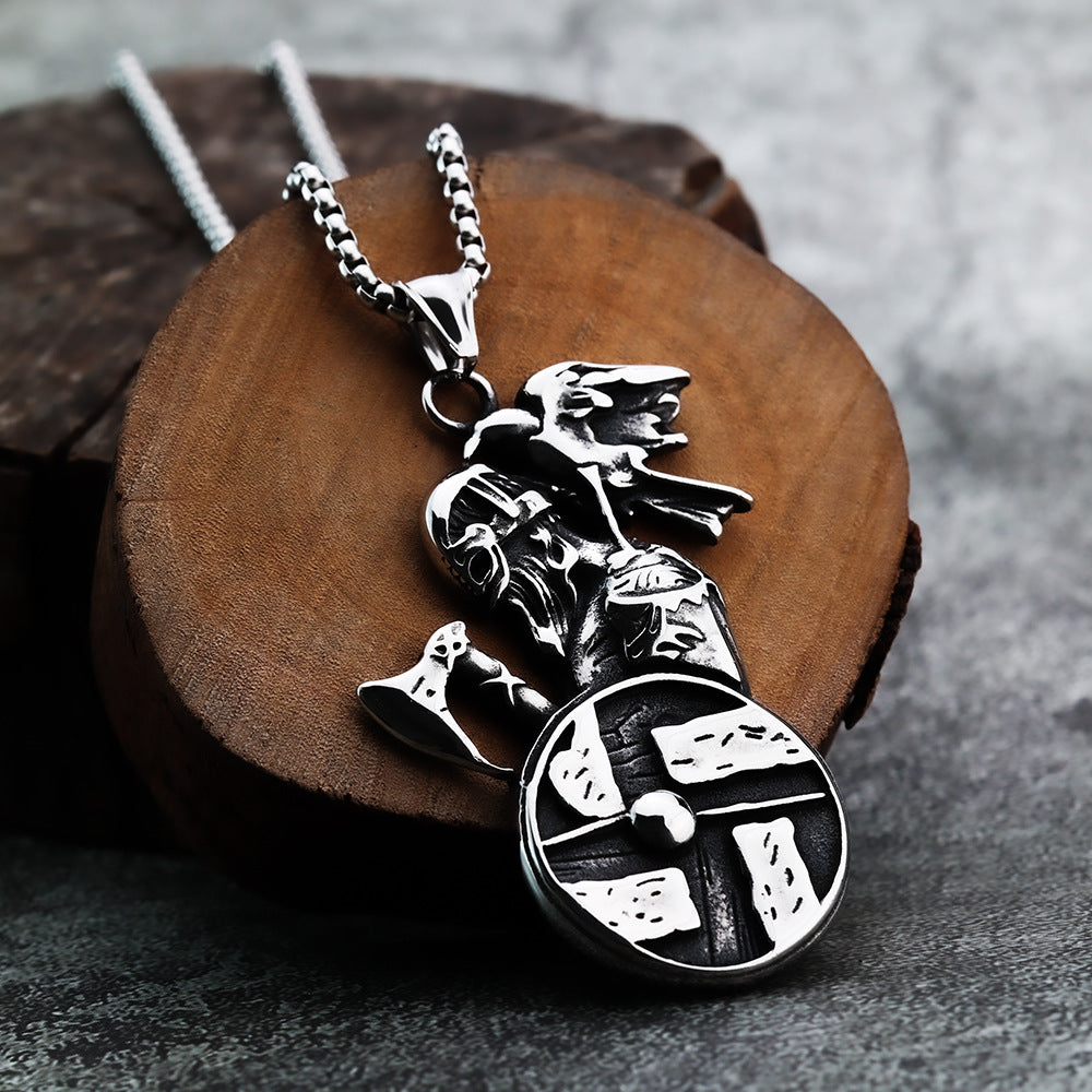 Crafted from high-quality Titanium Steel, this pendant not only showcases durability but also exhibits a rugged elegance that stands the test of time. The intricate design features iconic Viking symbols, including a fierce axe and shield, representing strength and bravery.