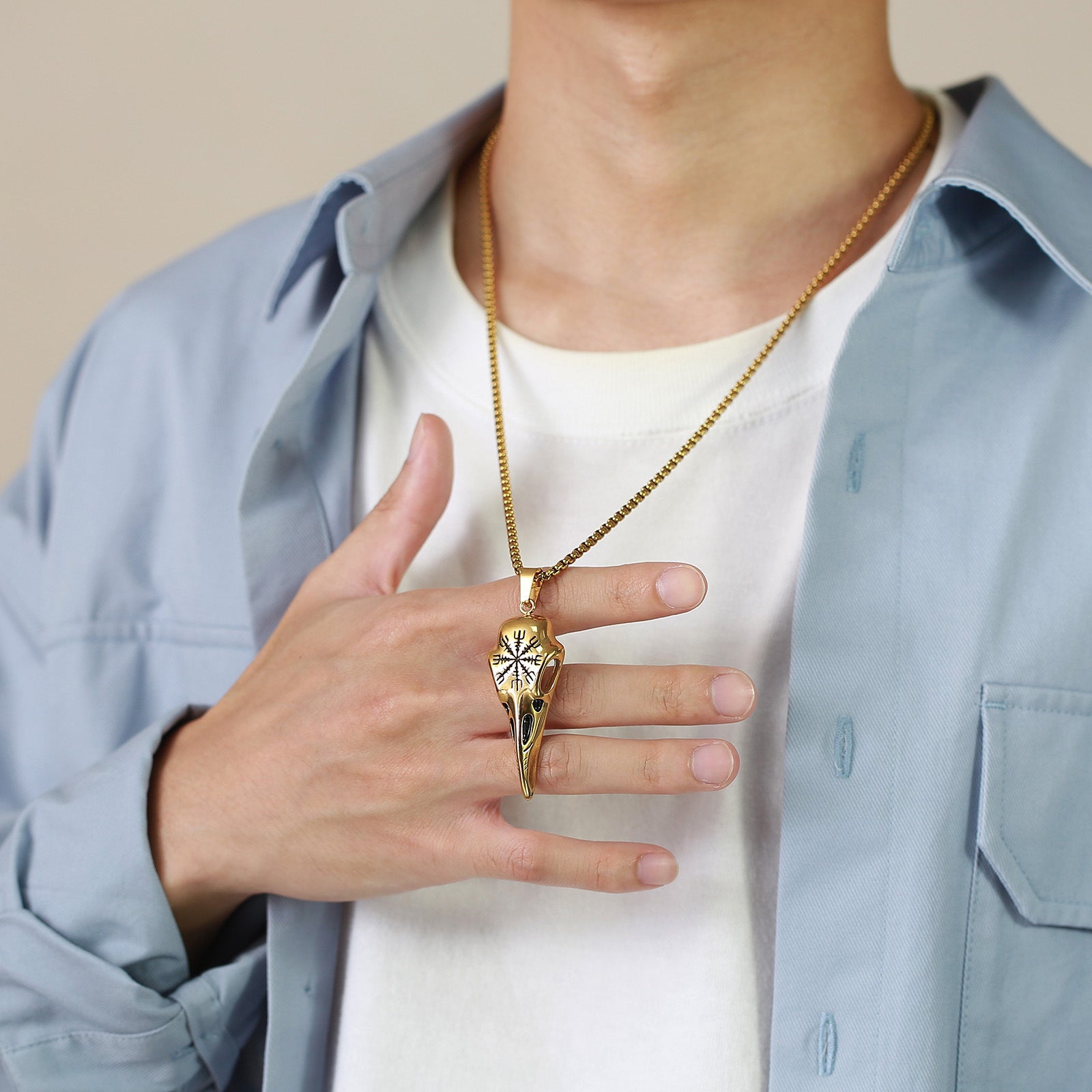 Elevate your jewelry collection with the Stainless Steel Viking Crow Skull Pendant Gold Men's Necklace Wholesale, European and American Jewelry for men, where elegance meets rugged charm.