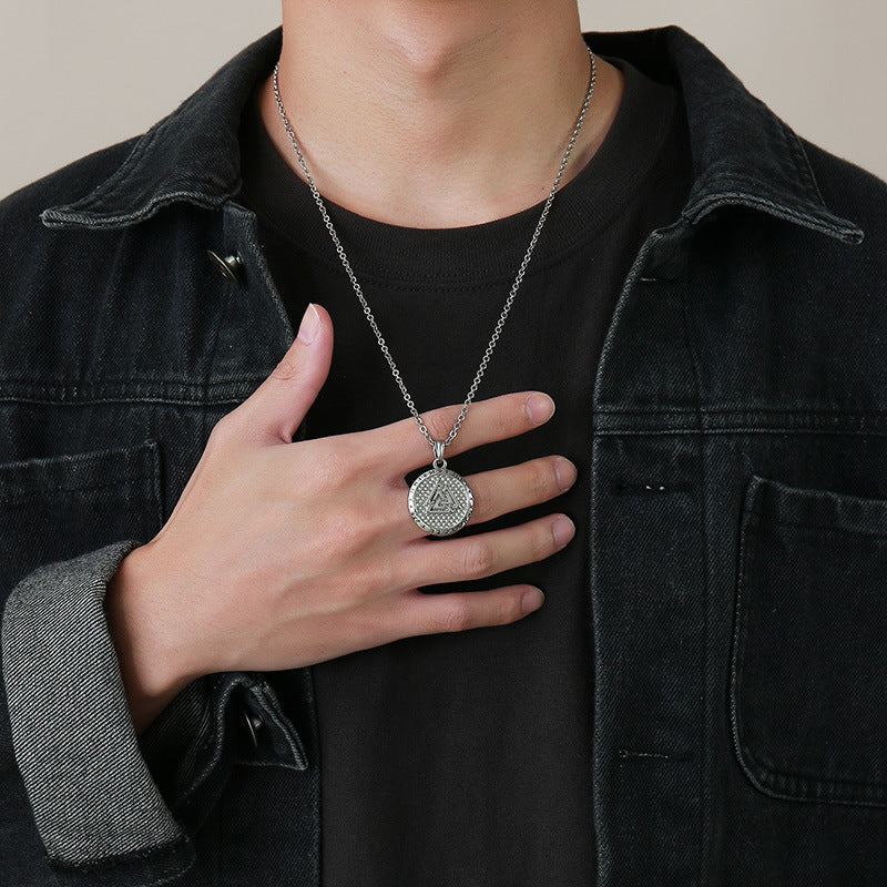 Introducing the exquisite Stainless steel Viking pendant, black men's steel round brand lettering necklace, foreign trade jewelry for men. This striking piece blends modern design with Viking-inspired elements, making it a perfect accessory for the contemporary man who appreciates uniqueness and style. Crafted from high-quality titanium steel, this necklace is not only durable but also lightweight, ensuring comfort for everyday wear.