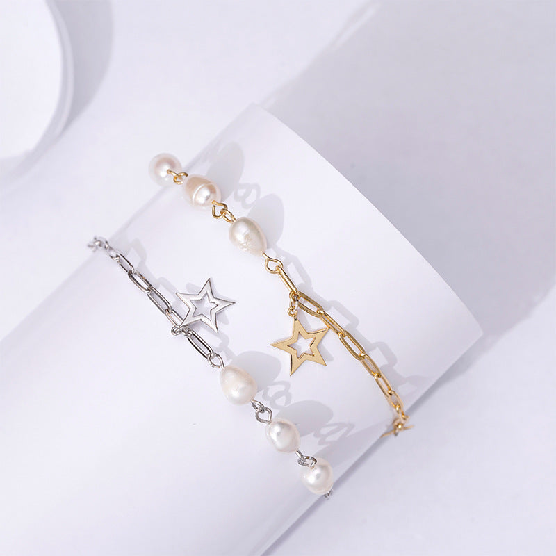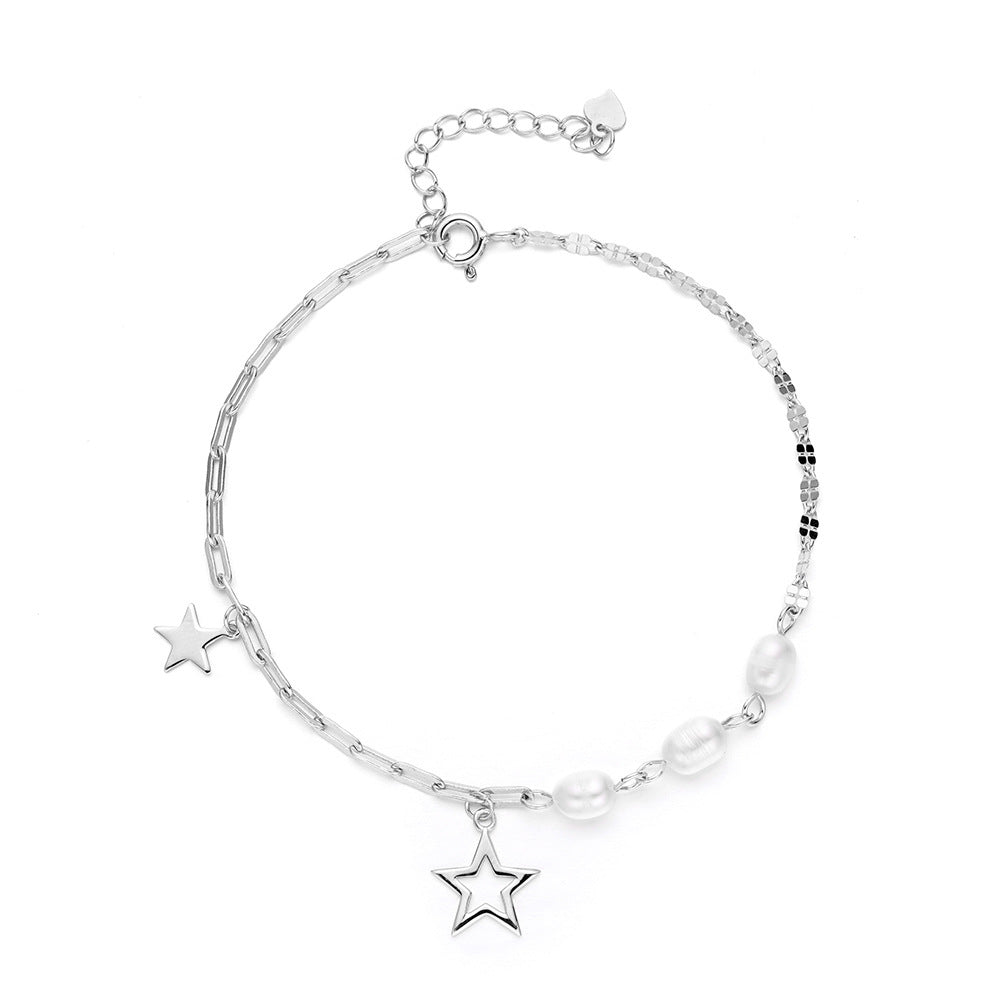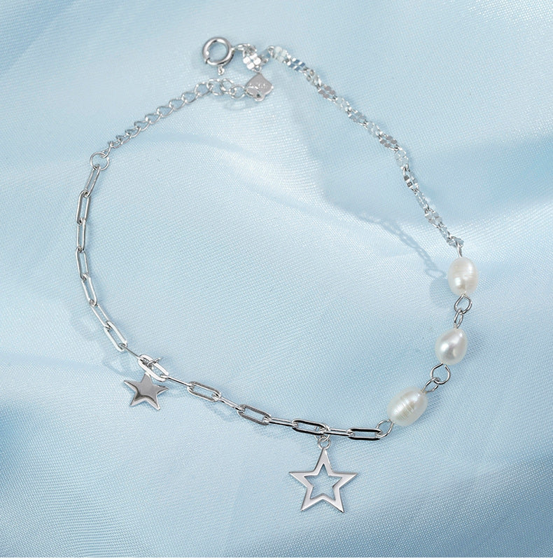 Achieve stylish sophistication with the Star Natural Freshwater Pearl Silver Bracelet. Featuring two star pendants and a part of chain composed by Natural Freshwater Pearls, this exquisite Silver Bracelet adds a luxurious shine to any look.