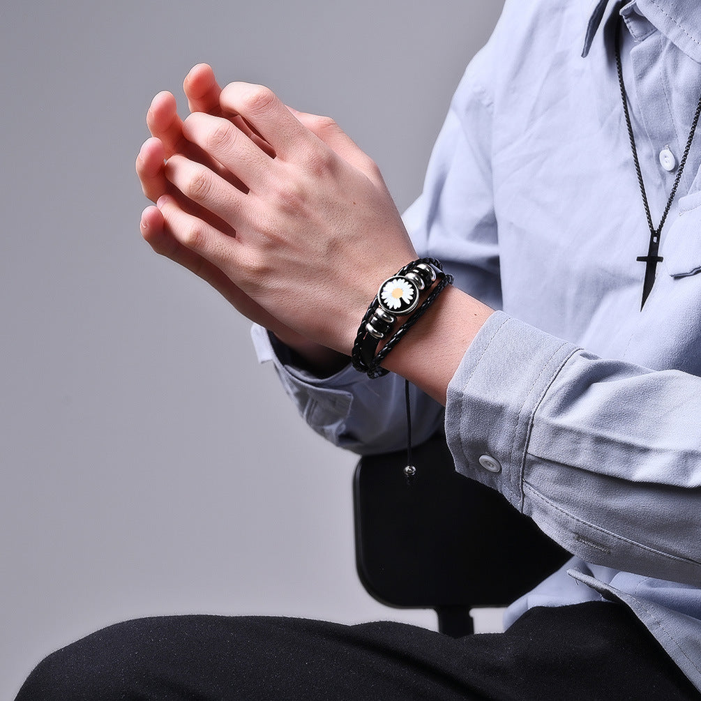 Elevate your accessory game with the Sunflower Daisy Stainless Steel Leather Rope Bracelet. This unique piece is a perfect blend of style and durability, designed for the modern man who appreciates both elegance and comfort.