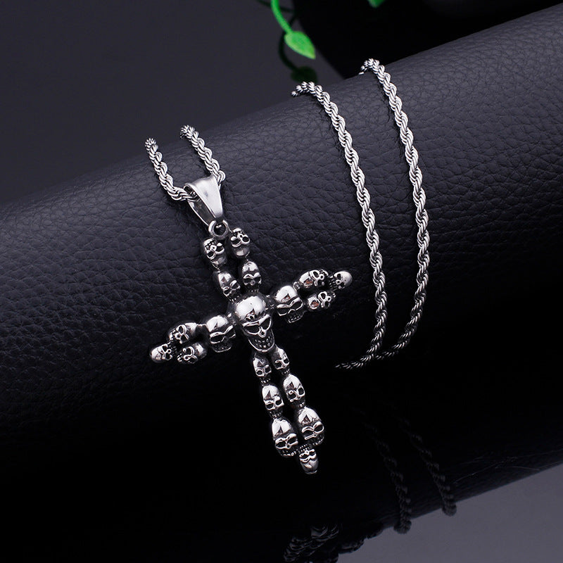 Elevate your accessory game with the European and American personalized jewelry, featuring a striking titanium steel men's skull cross pendant. This unique piece is designed for the modern man who dares to stand out.