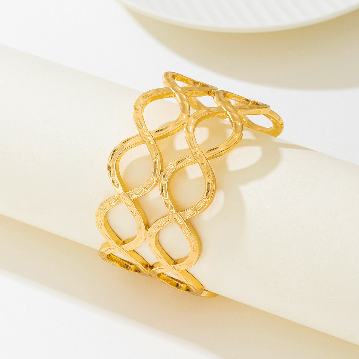 Fashionable European and American High-End Exaggerated Metal Texture Geometric Round Hollow Pattern Women's Opening Bracelet by Planderful delivers a stunning statement piece for any fashion-forward occasion. This exquisite bracelet is designed to elevate your style with its unique and luxurious look, making it the perfect accessory for both casual outings and formal events.
