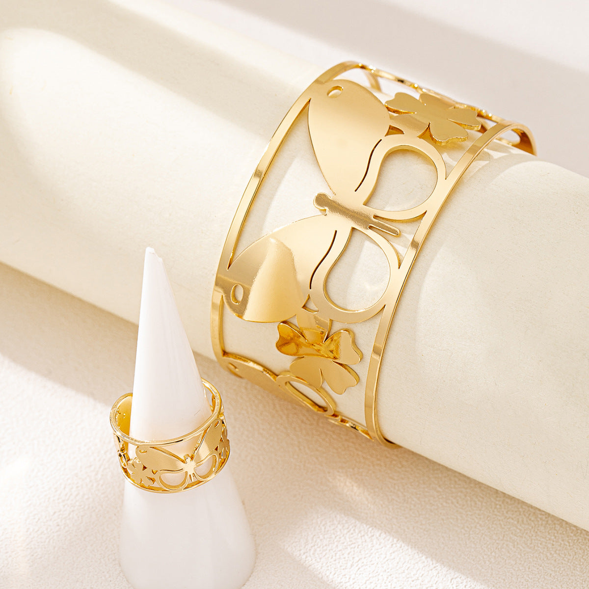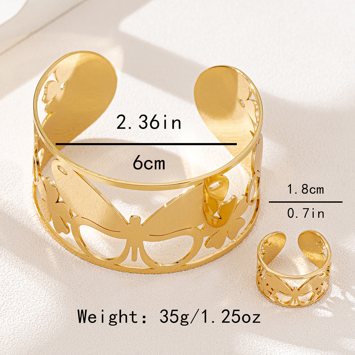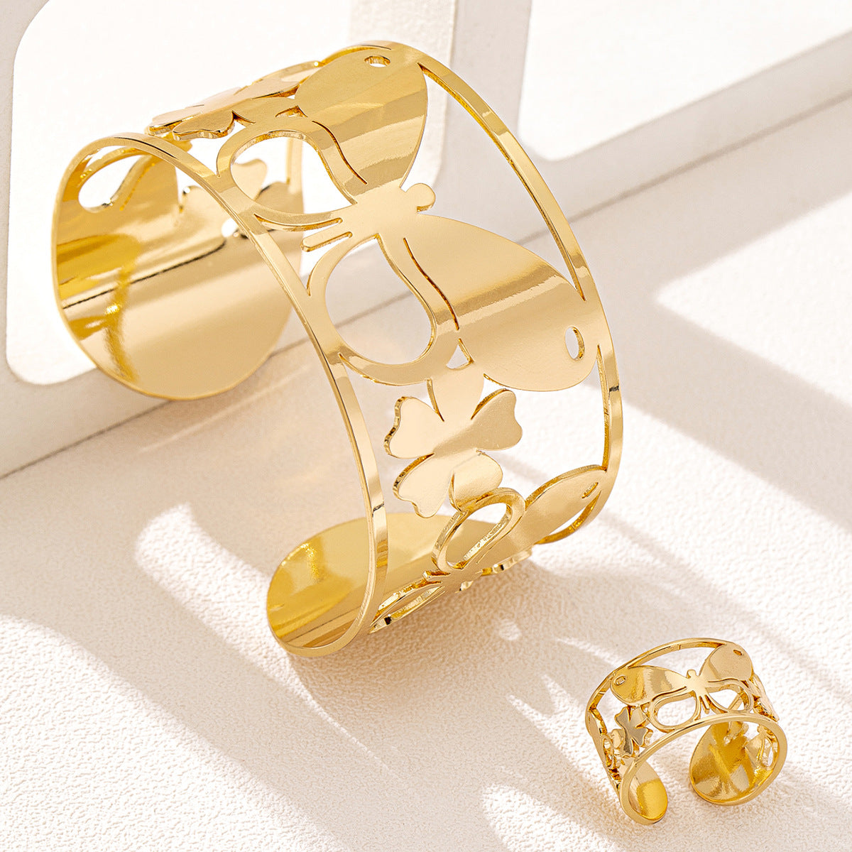 Each piece showcases an intricate hollow texture that resembles delicate flower and butterfly motifs, making them not just accessories but true statements of art. The adjustable opening of the ring ensures a perfect fit, allowing for comfortable wear throughout the day. The bracelet complements the ring beautifully, adding a touch of sophistication to any outfit.