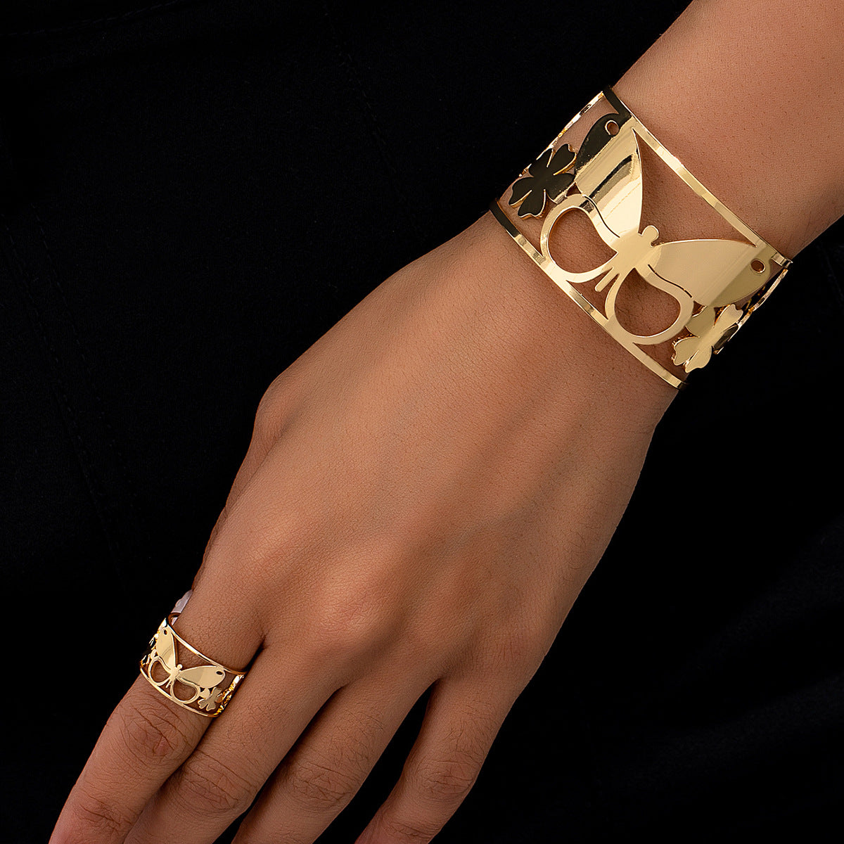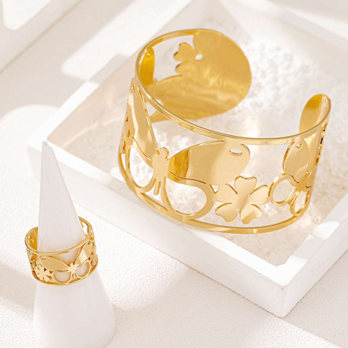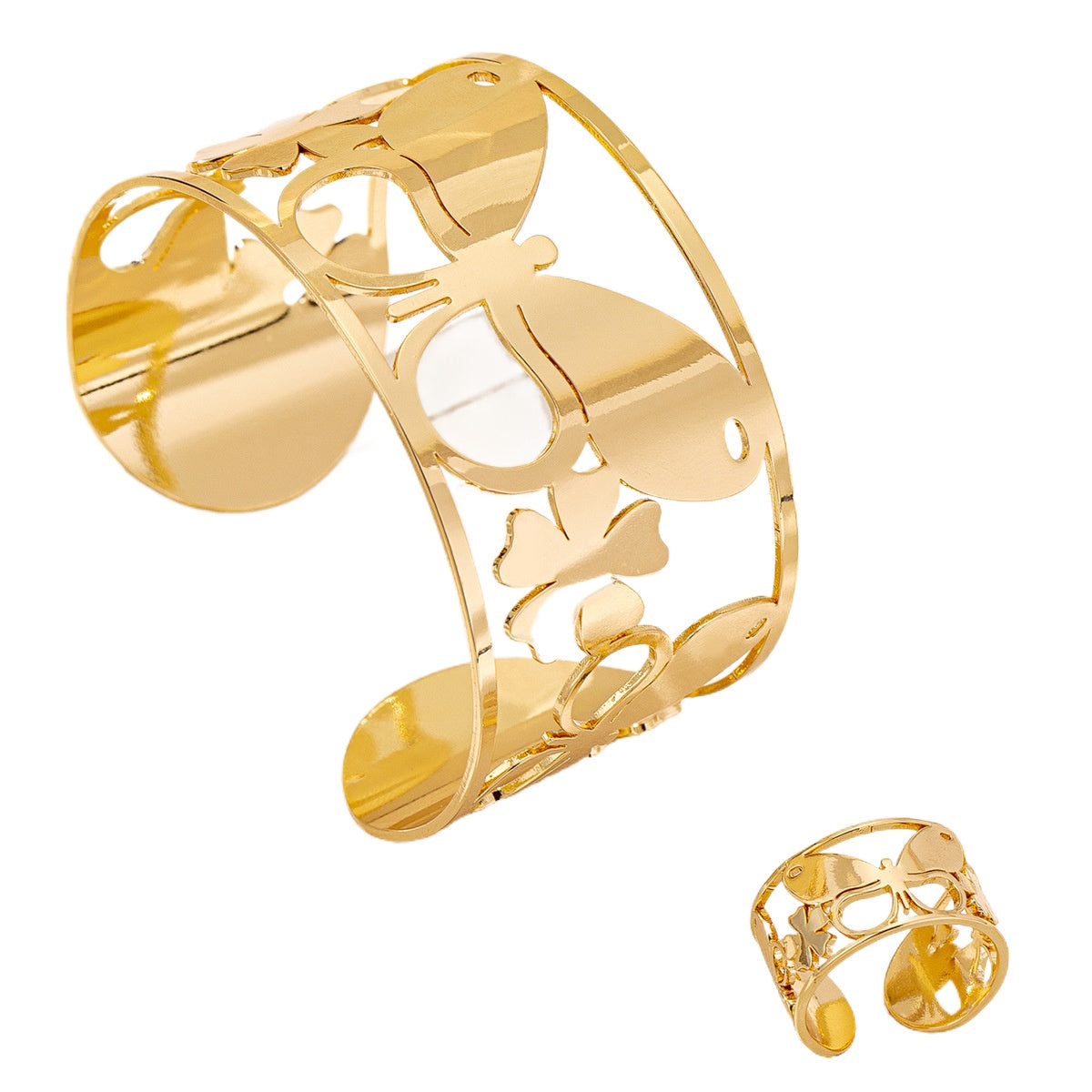 Each piece showcases an intricate hollow texture that resembles delicate flower and butterfly motifs, making them not just accessories but true statements of art. The adjustable opening of the ring ensures a perfect fit, allowing for comfortable wear throughout the day. The bracelet complements the ring beautifully, adding a touch of sophistication to any outfit.