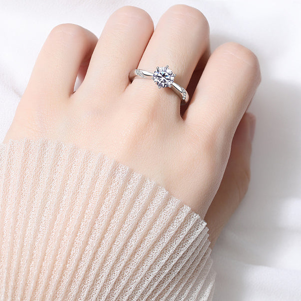 This Cathedral style Moissanite Round Cut Six Prongs Silver Ring for Women is crafted with beauty and care. An elegant six prong setting securely holds a round cut Moissanite stone, perfect for those who prefer a timeless and classic look. Enjoy the brilliance and light-reflections of Moissanite, a classic jewelry choice.