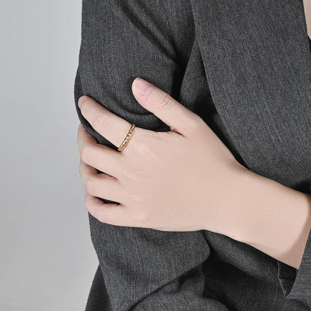 Crafted from high-quality 18K gold stainless steel, this ring offers both durability and a sophisticated shine, ensuring it withstands daily wear while making a bold fashion statement. Its unique twist bread design not only enhances its charm but also adds a touch of contemporary flair to any outfit.