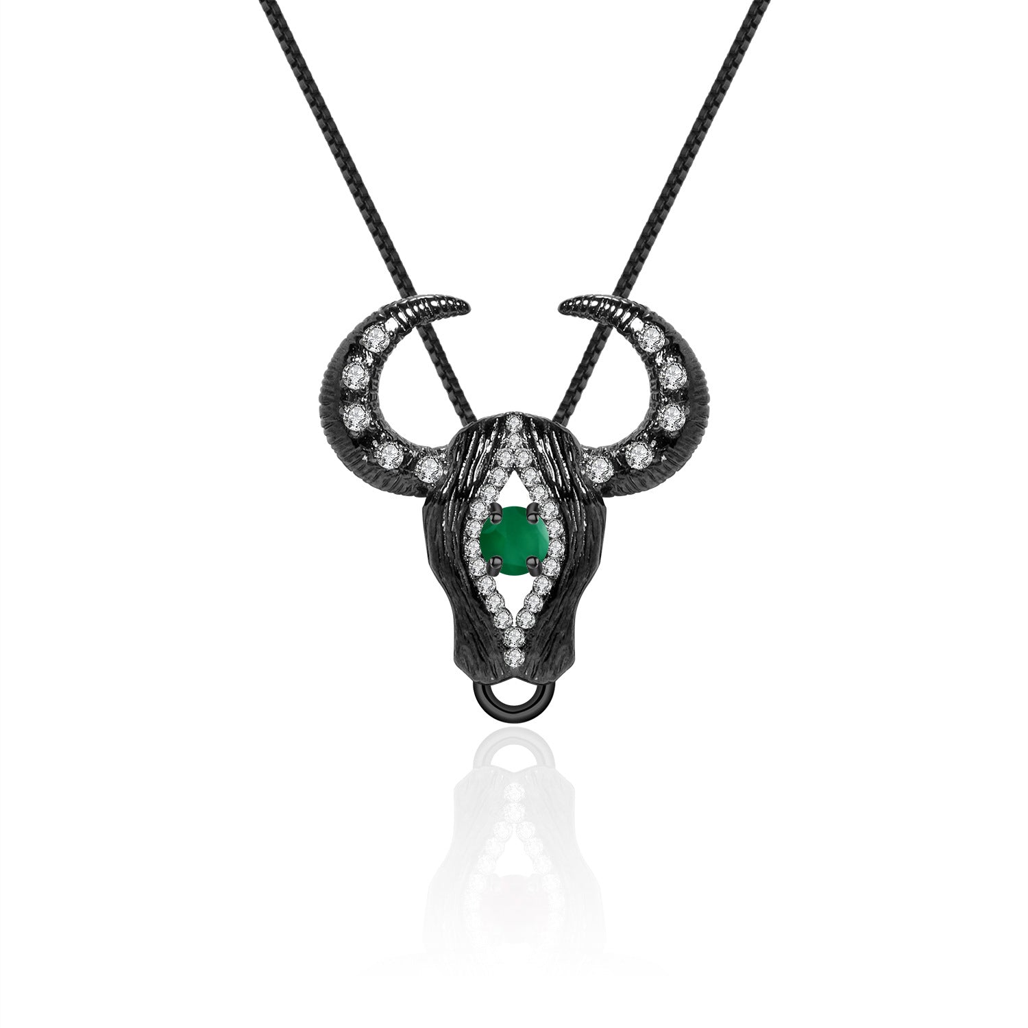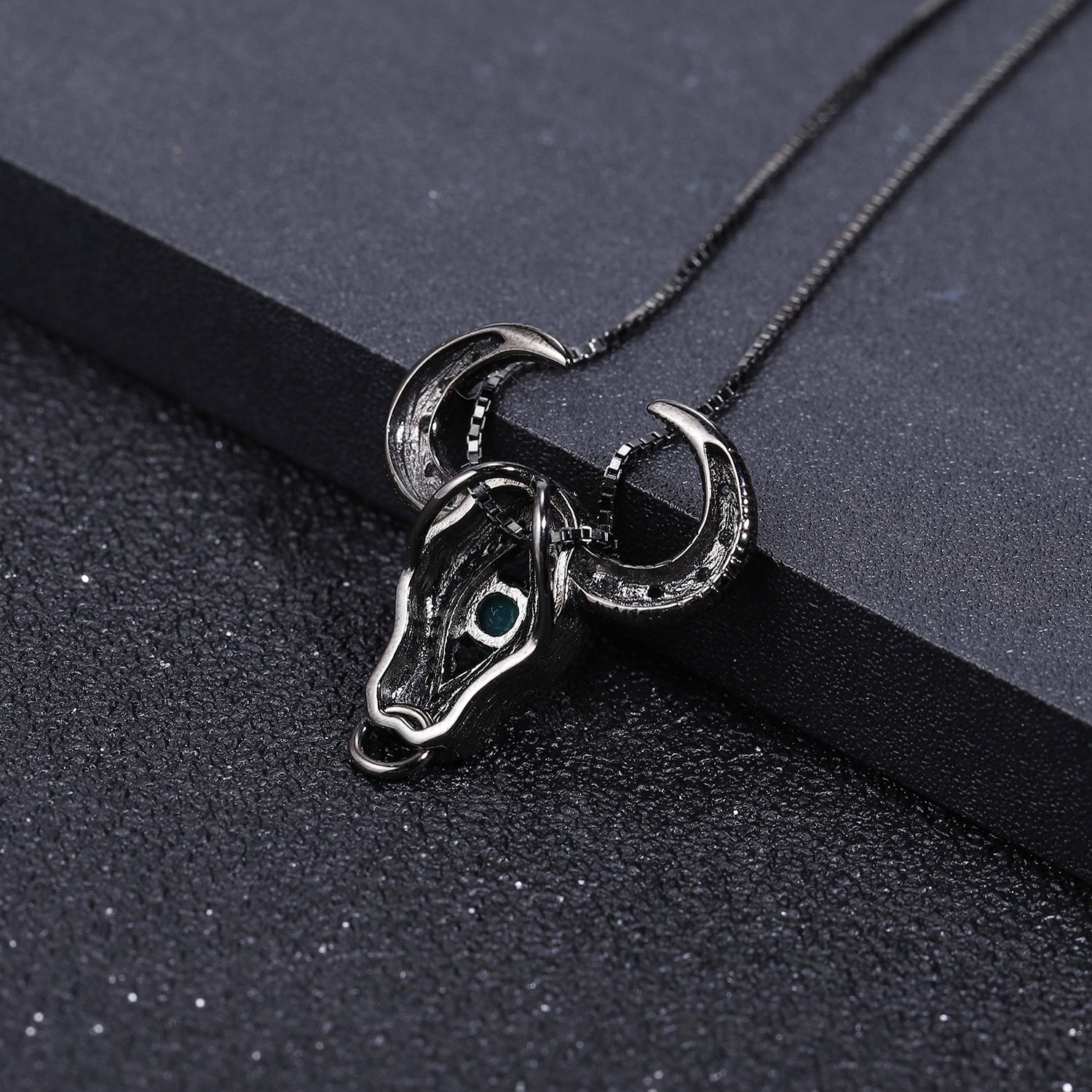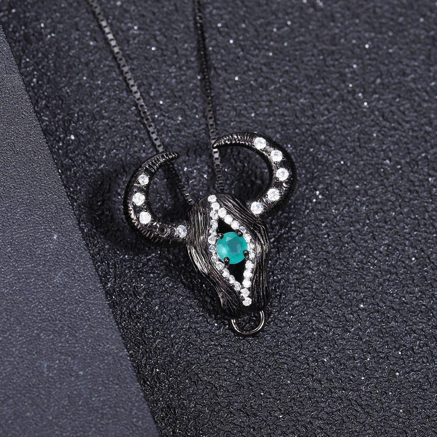 Dark Retro Design Oxhead Inlaid Natural Gemstone Pendant Silver Necklace for Women