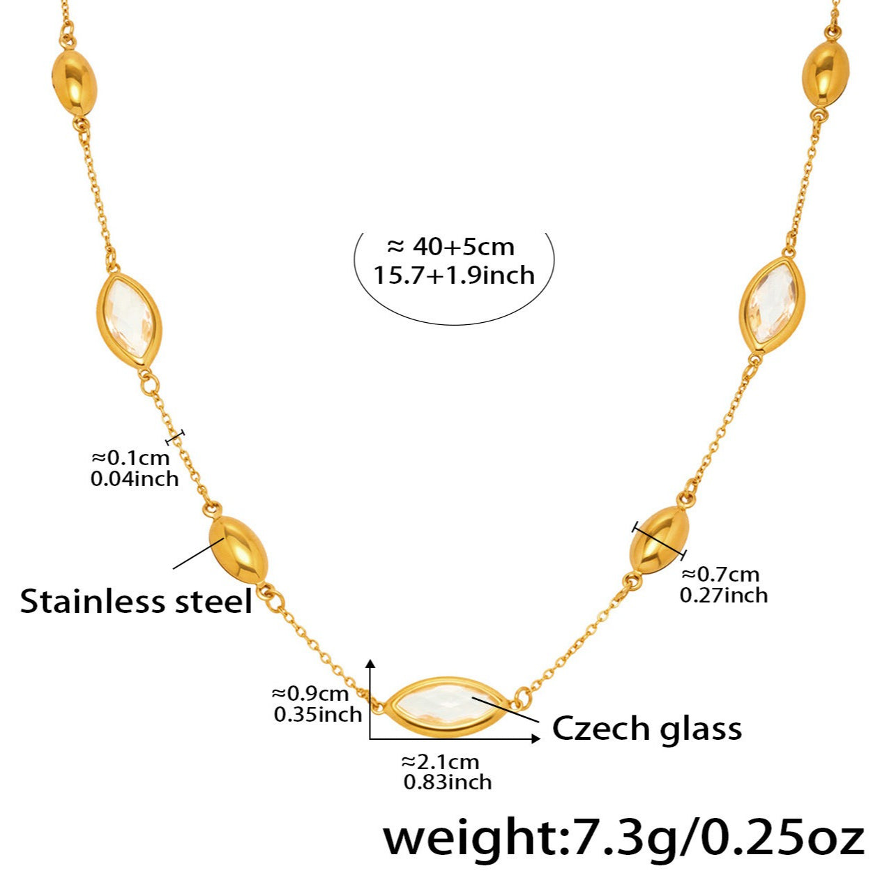 Wear it solo for a delicate statement or layer with other necklaces for a curated, chic look. The durable stainless steel ensures lasting shine, while the translucent glass captures light with every move, adding a touch of ethereal radiance to your neckline.