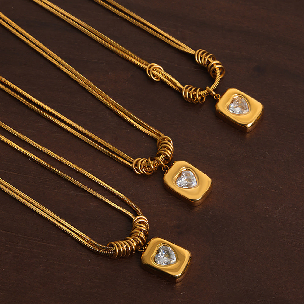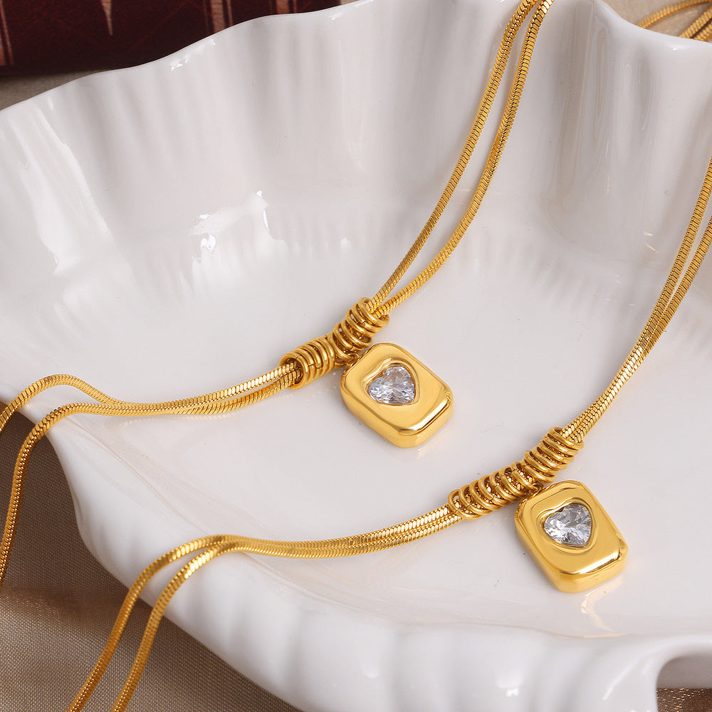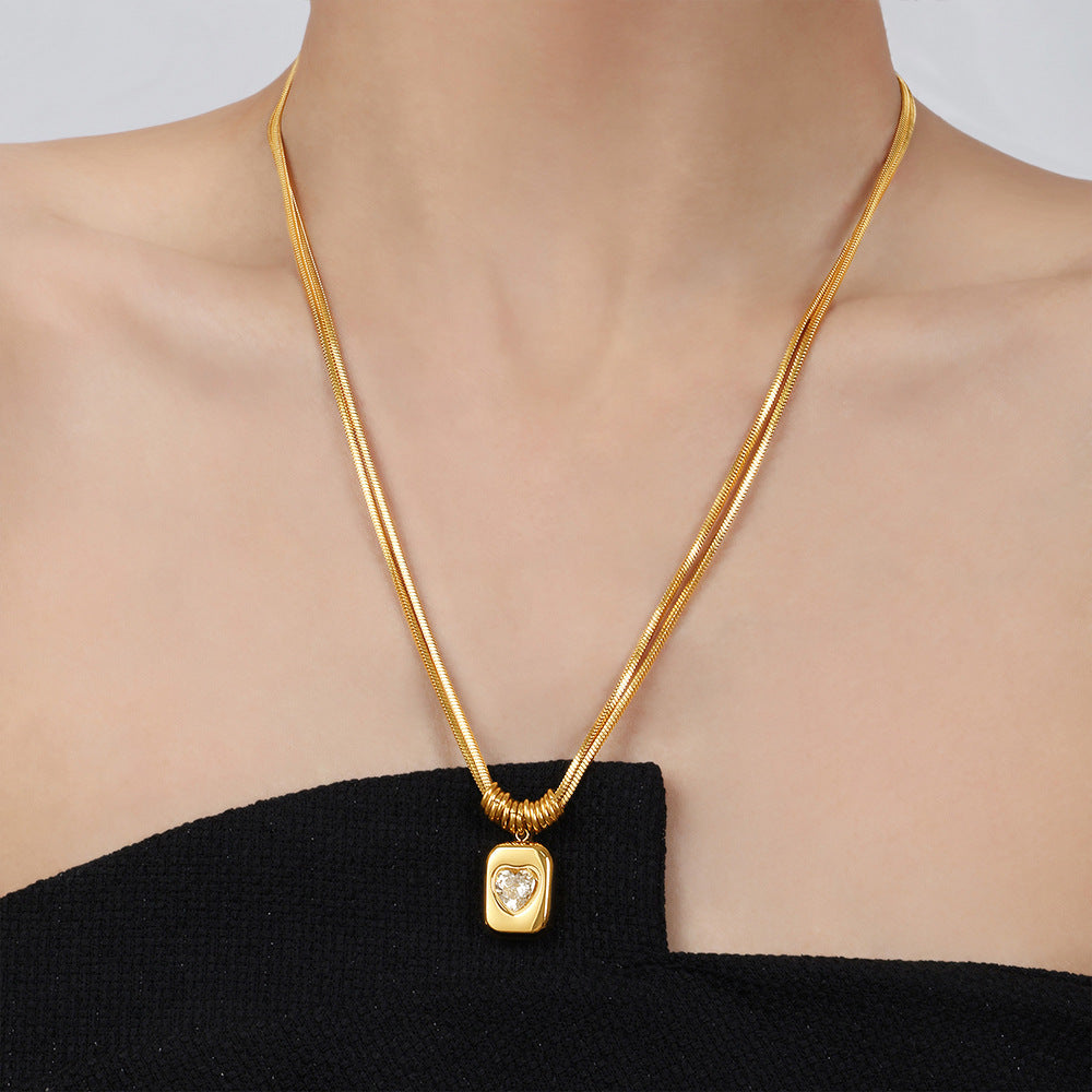 Unleash your inner fashion icon with our European and American cross-border retro necklace. This exquisite piece features a stunning peach heart love pendant, adding a touch of romance to your look. Crafted with light luxury double-layer snake bone chain and durable titanium steel, this necklace embodies both style and quality.