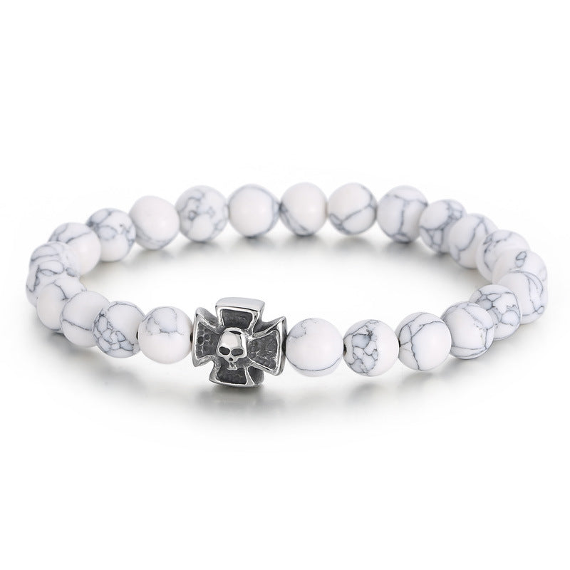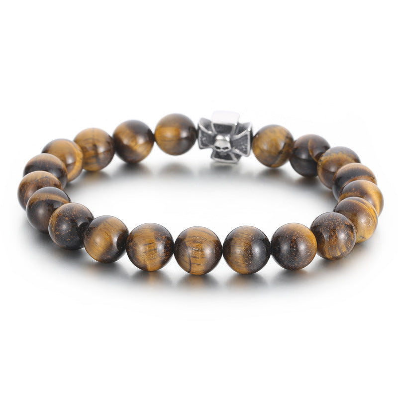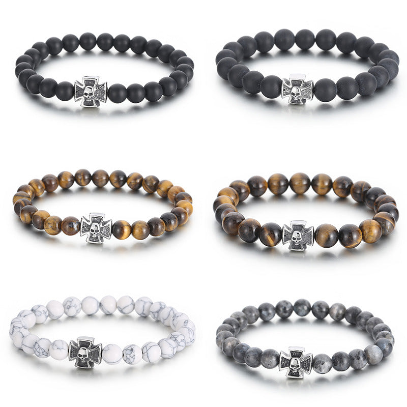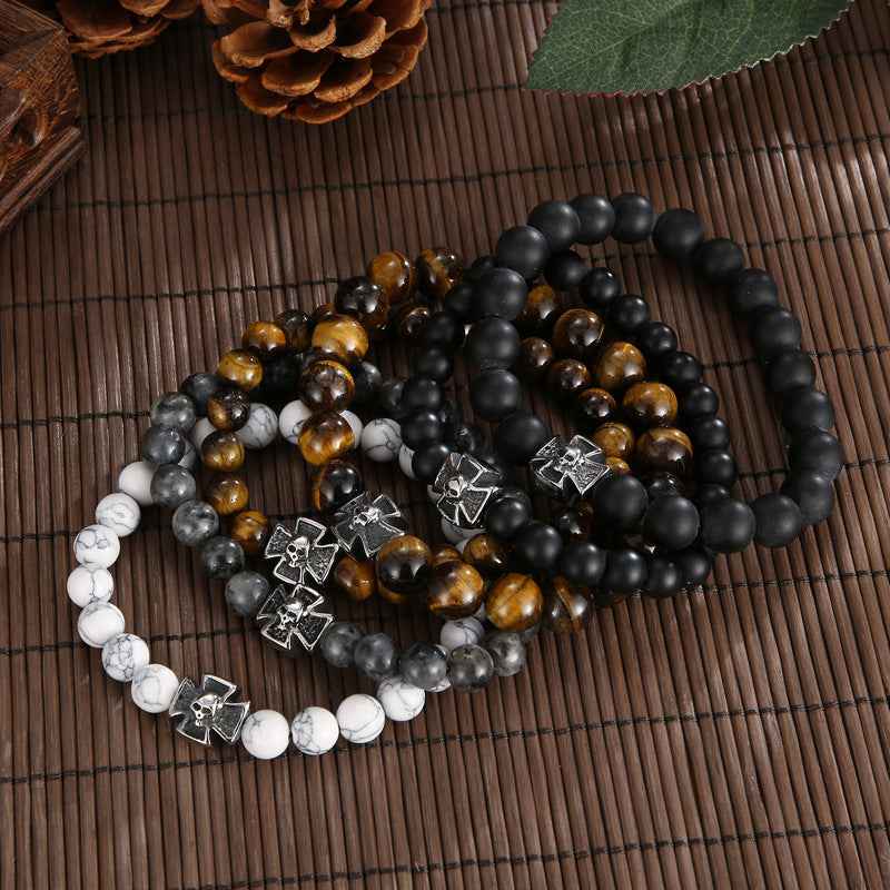 Men's Matte Black Agate and Turquoise Tiger's Eye Skull Bracelet with Titanium Steel Beads