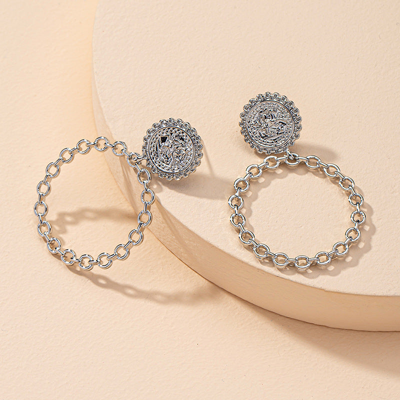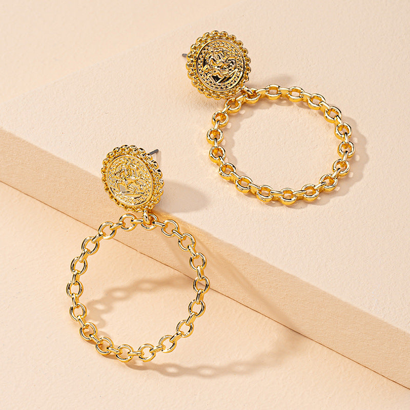 Discover the perfect blend of elegance and trend with our pair of gold coin chain buckle metal earrings, straight from the Amazon Earrings Jewelry Factory.