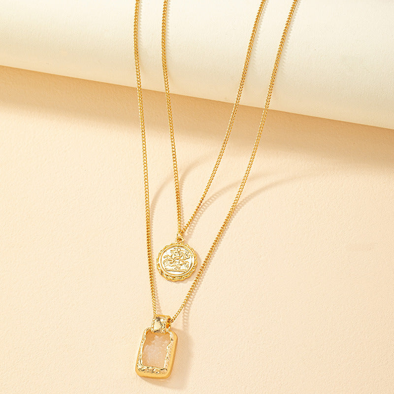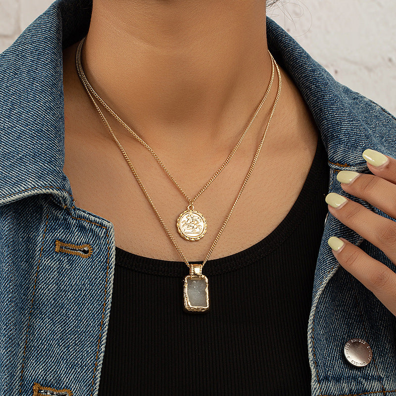 Introducing the European and American style double stacked hanging tag necklace, a fusion of elegance and hip-hop flair. Elevate your look with this unique cold wind clavicle chain featuring niche coin pendants that exude individuality.