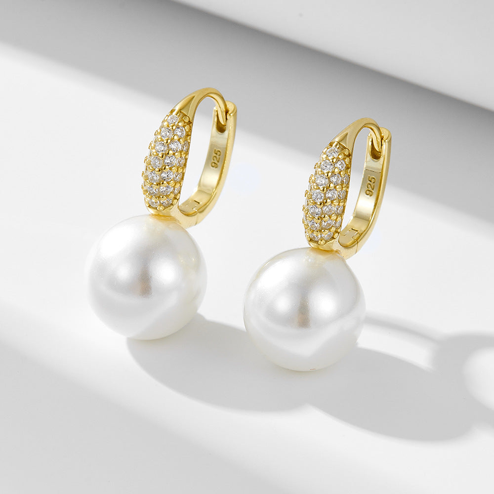 Round Pearl Zircon Sterling Silver Hoop Earrings