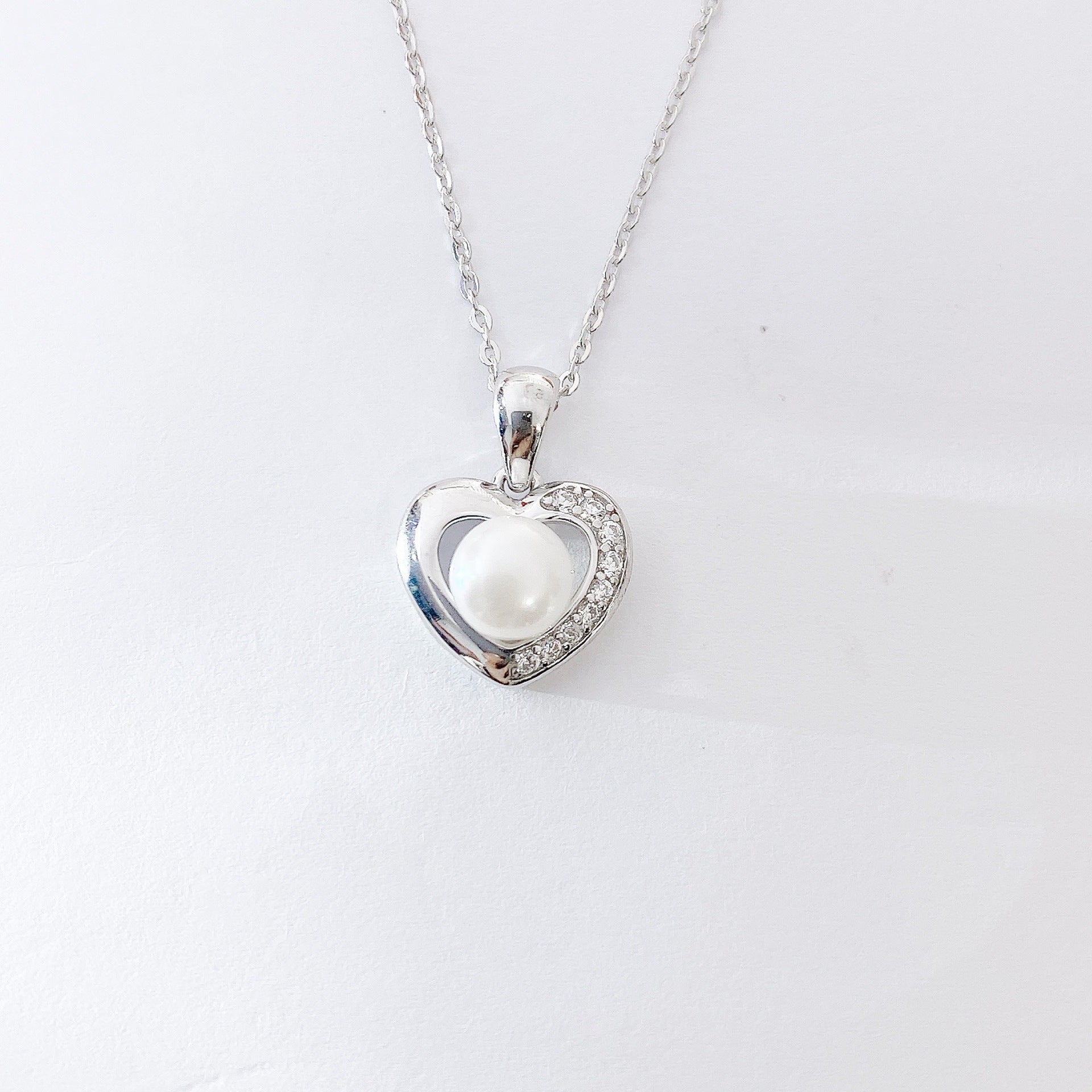 Half Zircon Hollow Heart with Natural Pearl Pendant Silver Necklace for Women
