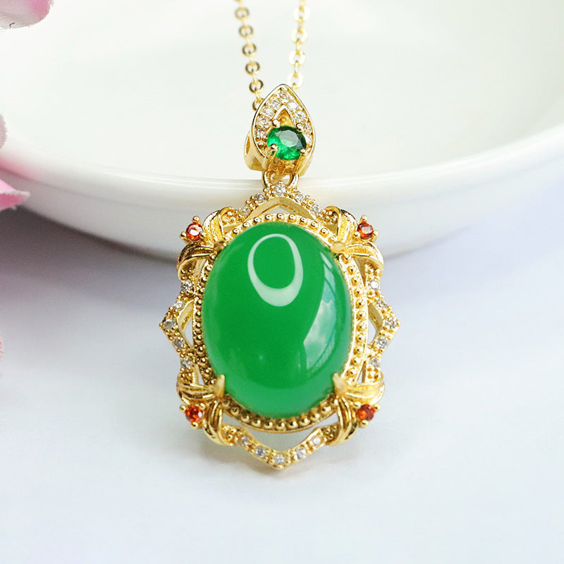 Indulge in the retro charm of our Oval Green Chalcedony Pendant Necklace, exquisitely designed to add a touch of sophistication to any outfit. The stunning zircon detailing complements the luscious green chalcedony, creating a mesmerizing piece that is sure to turn heads.