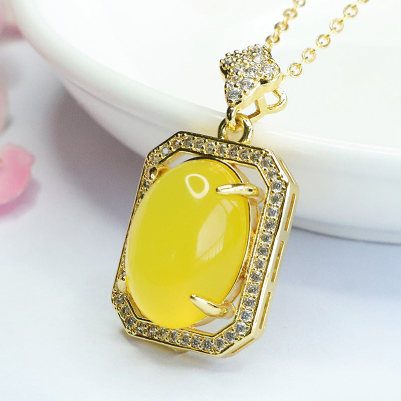 • Adorned with a stunning Pigeon Egg Yellow Chalcedony gemstone and shimmering Zircon accents
