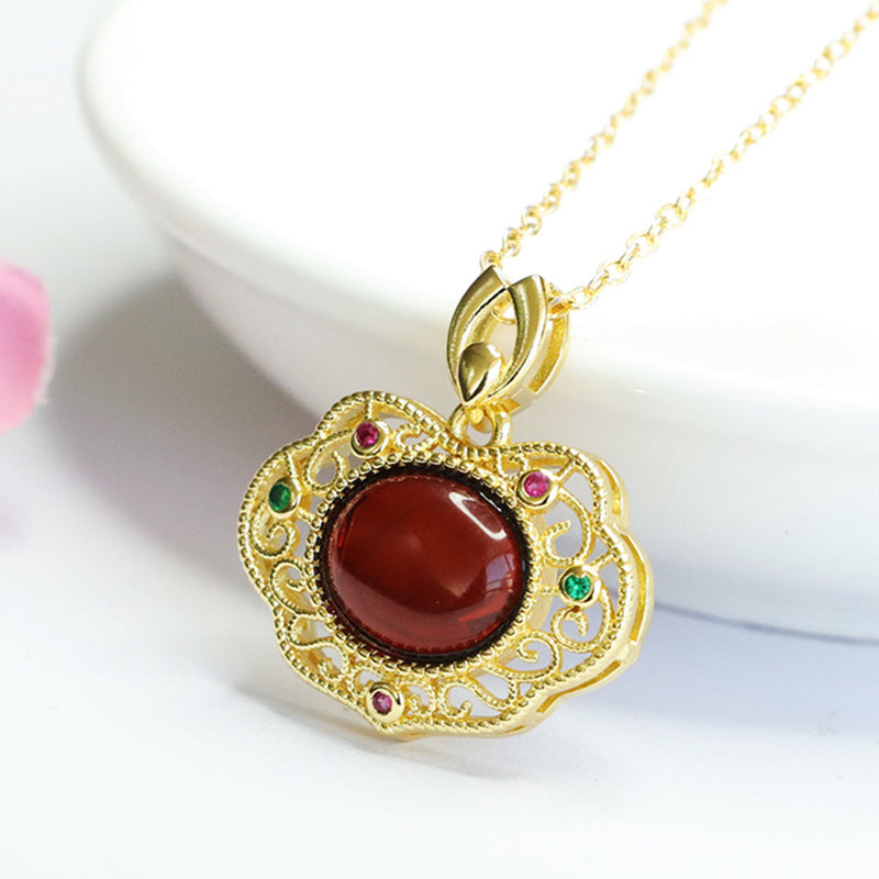 Indulge in the exquisite beauty of this Natural Oval Blood Amber Hollow Ruyi Pendant. Crafted with precision and adorned with beeswax amber, this sterling silver pendant exudes elegance and charm. Whether for a special occasion or daily wear, this pendant is sure to add a touch of sophistication to any outfit.