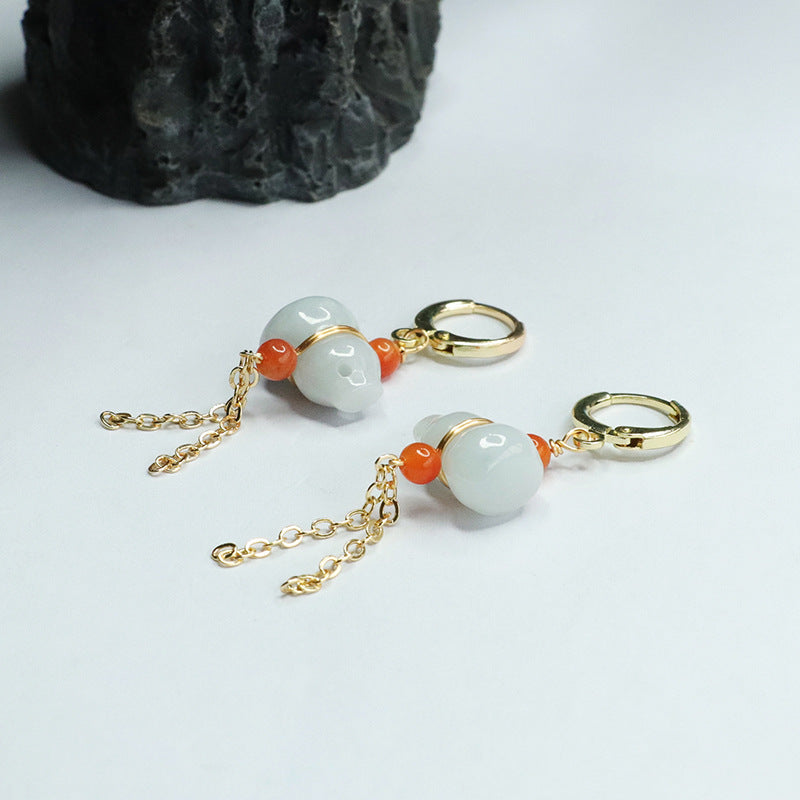 Ear Hoop Earrings with Natural Myanmar A Grade Jade Gourd and Tassel