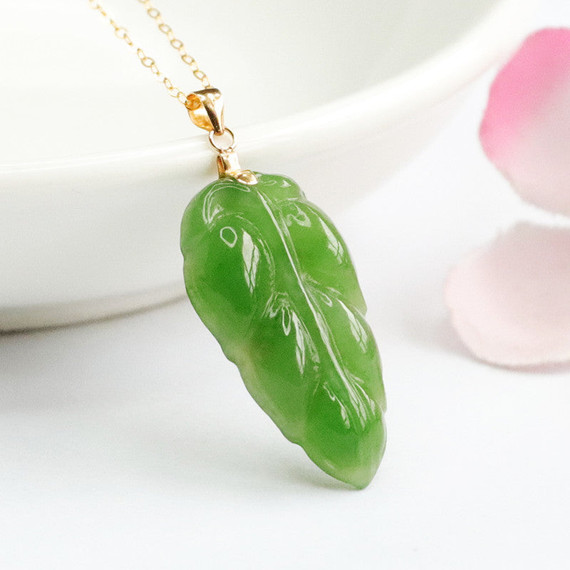 Jade Leaf Pendant Necklace in Russian Green Hotan Jade