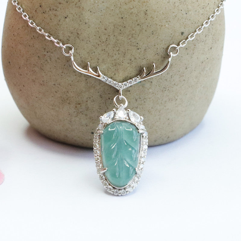 Sterling Silver Natural Jade Pendant Blue Green Leaf Zircon Antler Necklace