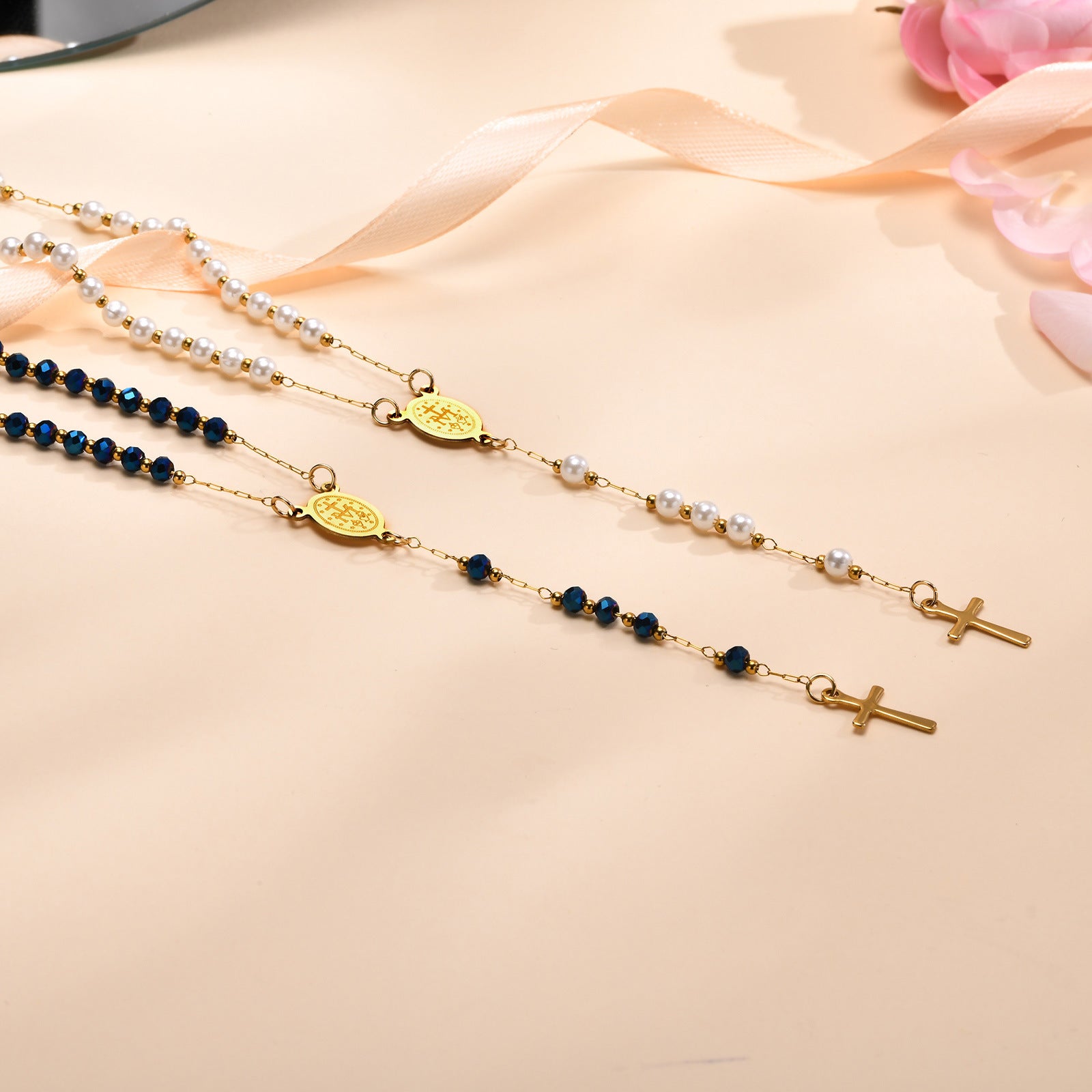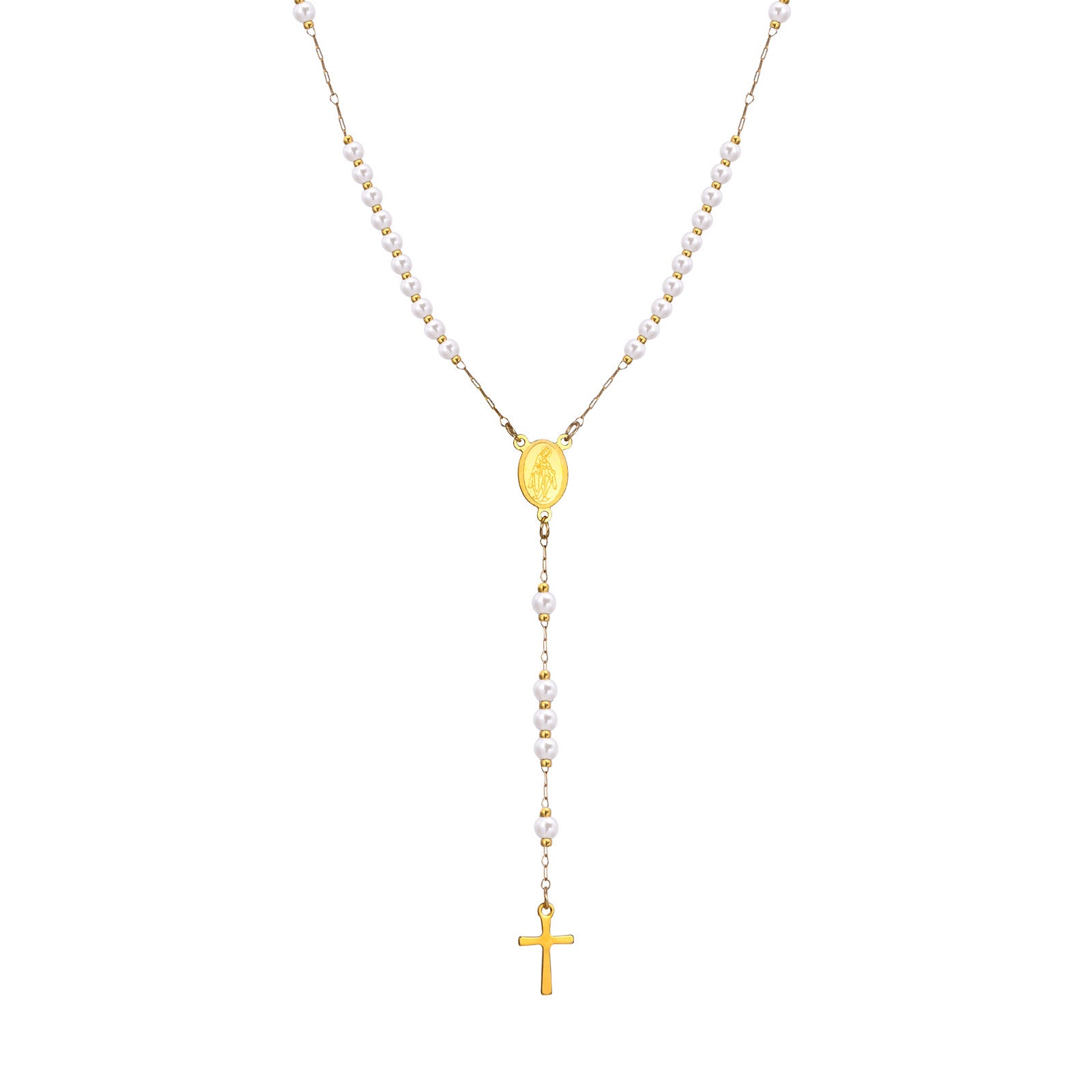 Elevate your jewelry collection with this beautiful piece that embodies both style and spirituality. The Ladies Stainless Steel Virgin Mary Cross Imitation Pearl Beaded Long Necklace Gold is not just an accessory—it's a statement of elegance and faith.