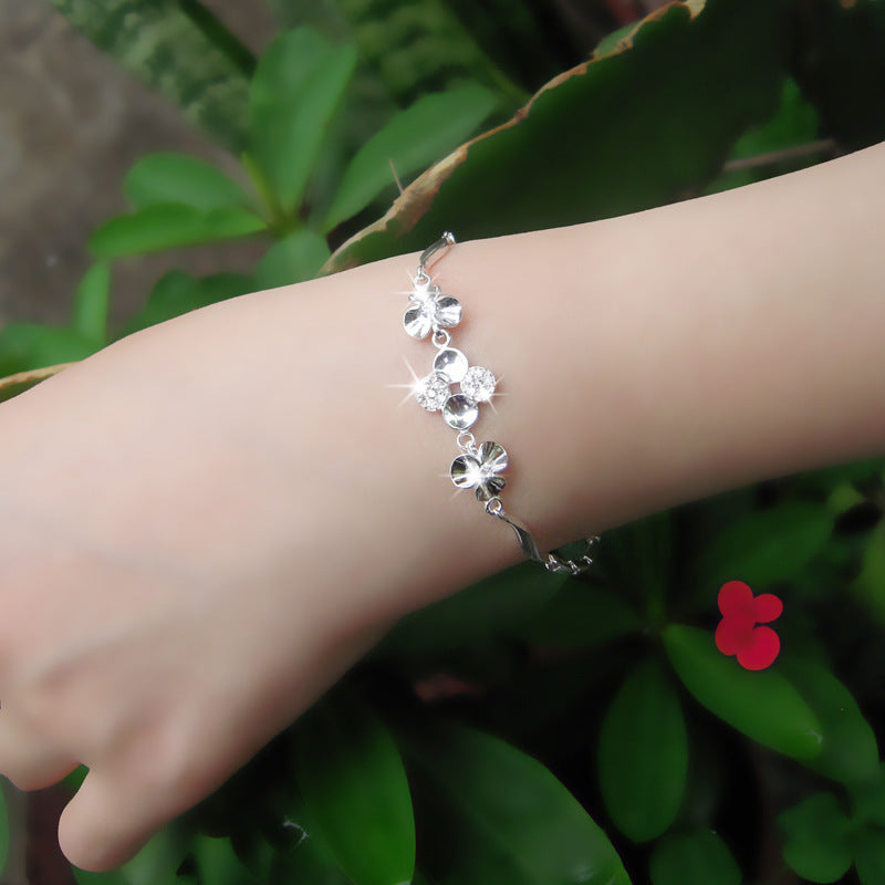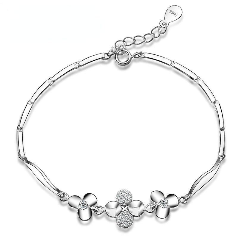 This Clover with Zircon Silver Bracelet for Women will add sparkle to any look. Crafted with sterling silver, this bracelet features three beautiful clover adorned with zircon, offering a chic yet eye-catching finish. It's perfect for special occasions or everyday wear.