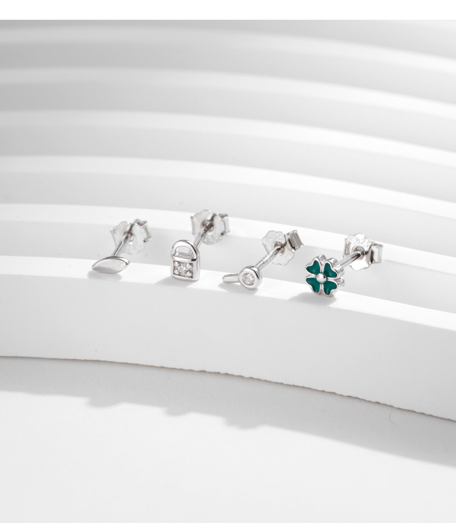 S925 Sterling Silver Small Fresh Natural Lucky Four-Leaf Clover Key Lock Exquisite Stud Earrings Set by Planderful delivers a touch of elegance and good fortune for your everyday outfits.