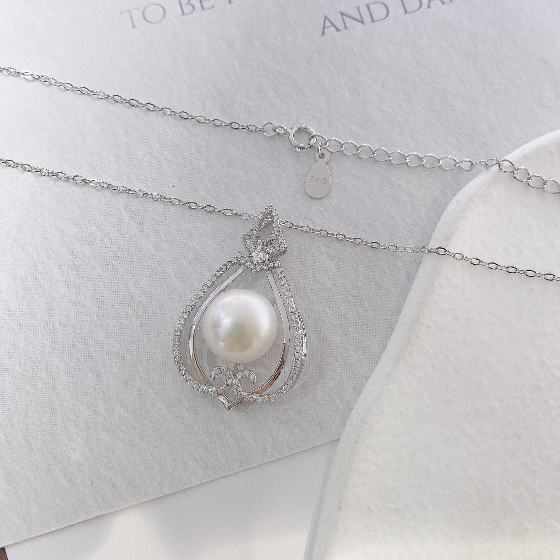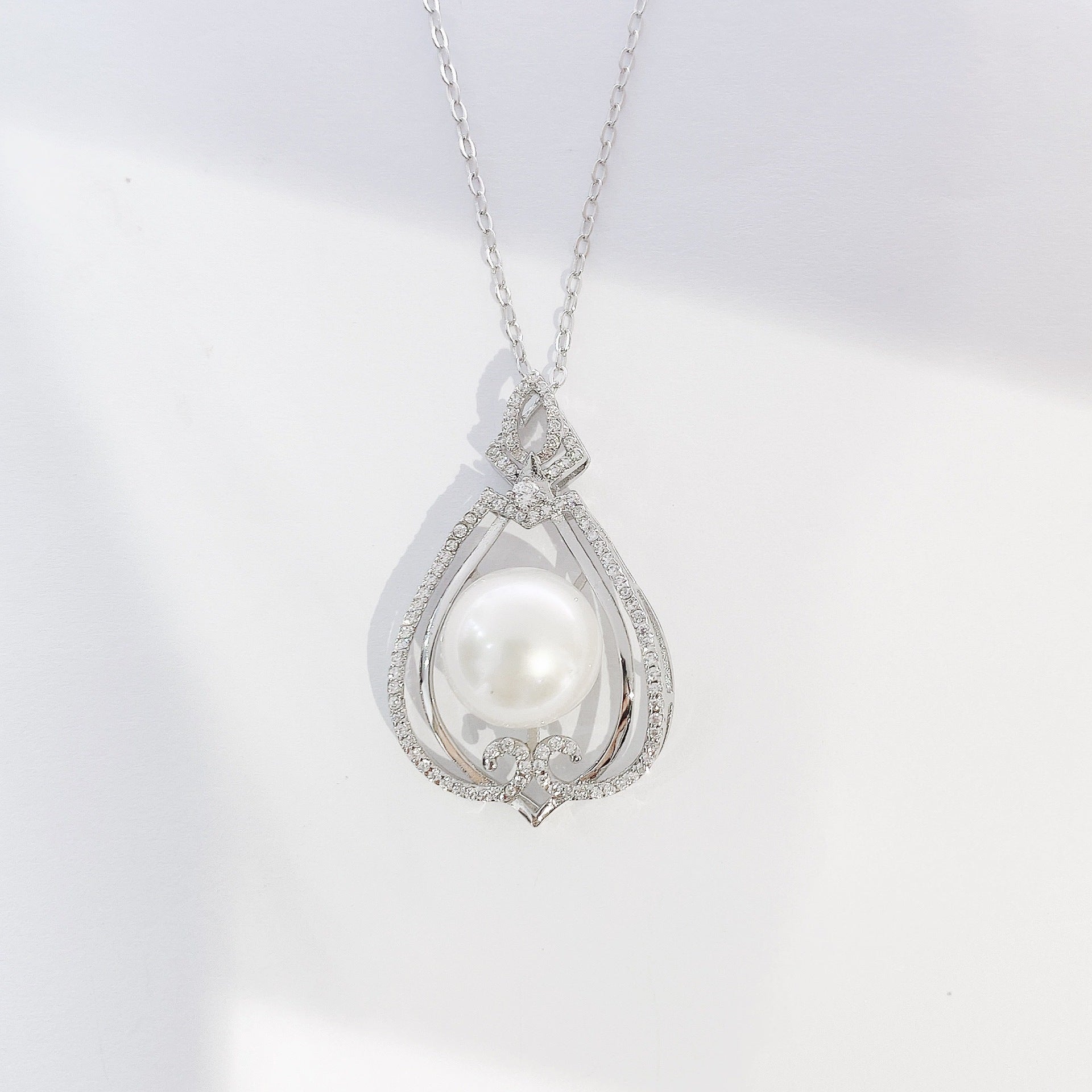 Hollow Pear Drop Shape with Round Natural Pearl Pendant Silver Necklace for Women