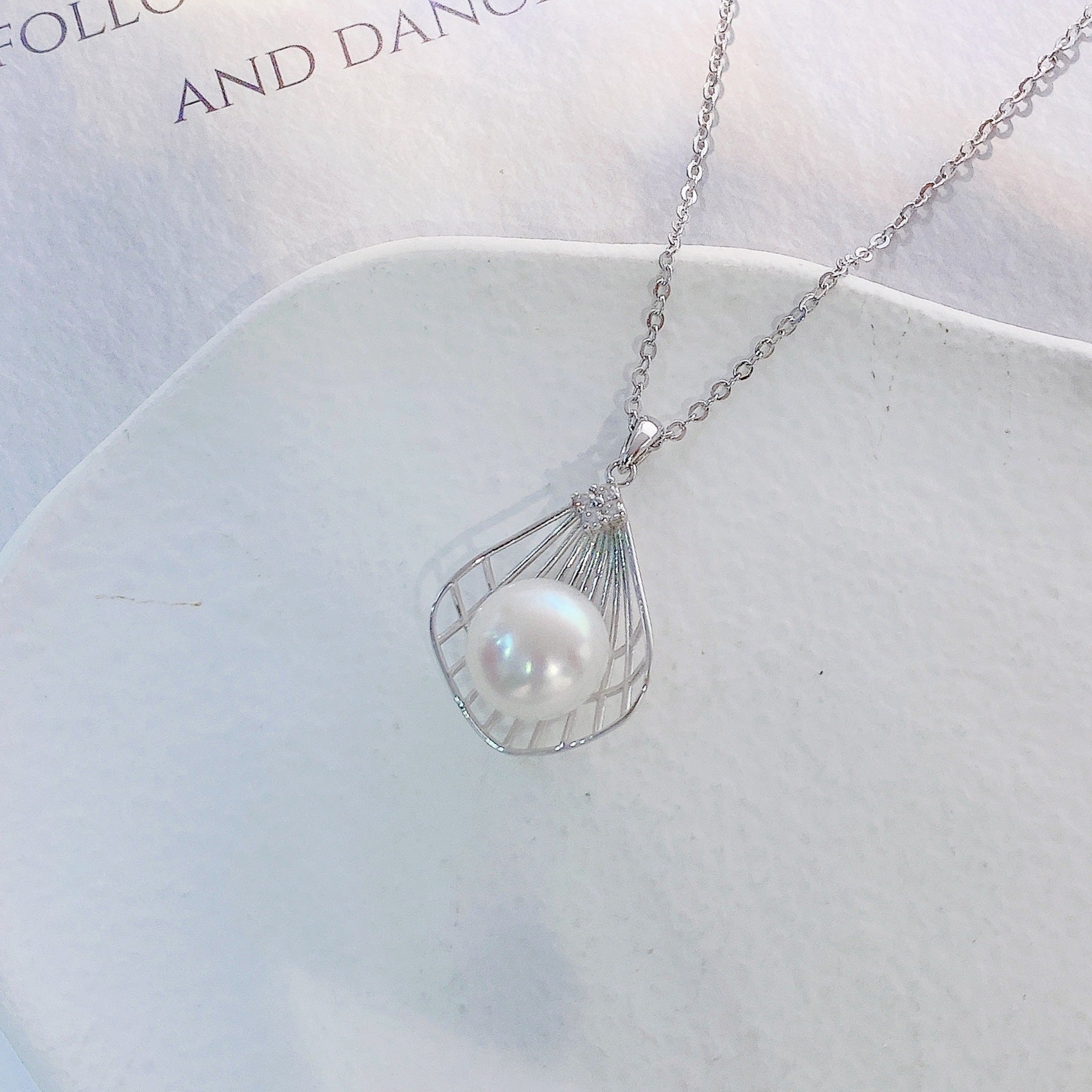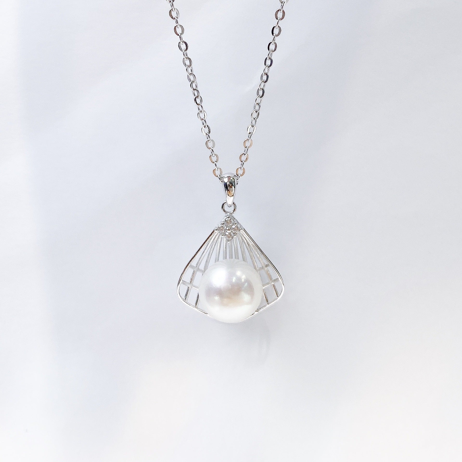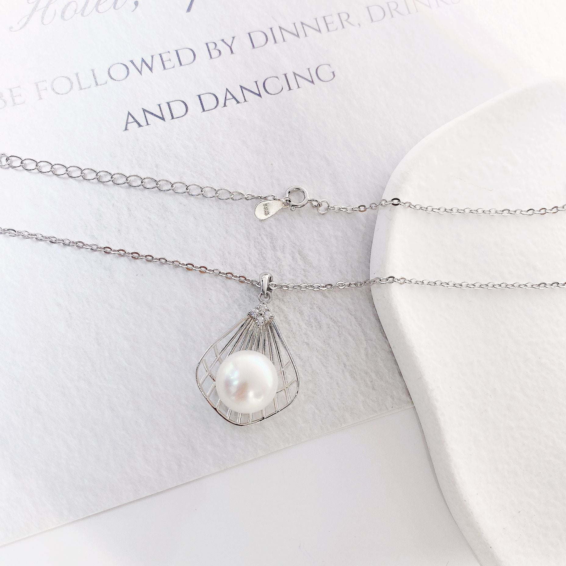 Natural Freshwater Pearl Hollow Fan-shape Pendant Silver Necklace for Women