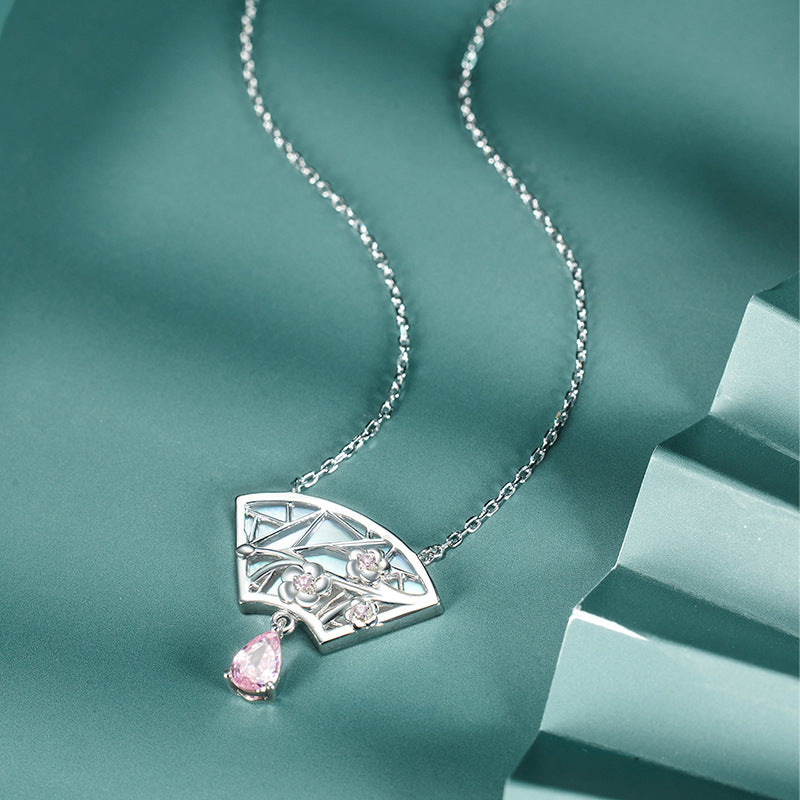 Plum Flower Pattern Fan Pendant Pear Shape Pink Zircon Sterling Silver Necklace
