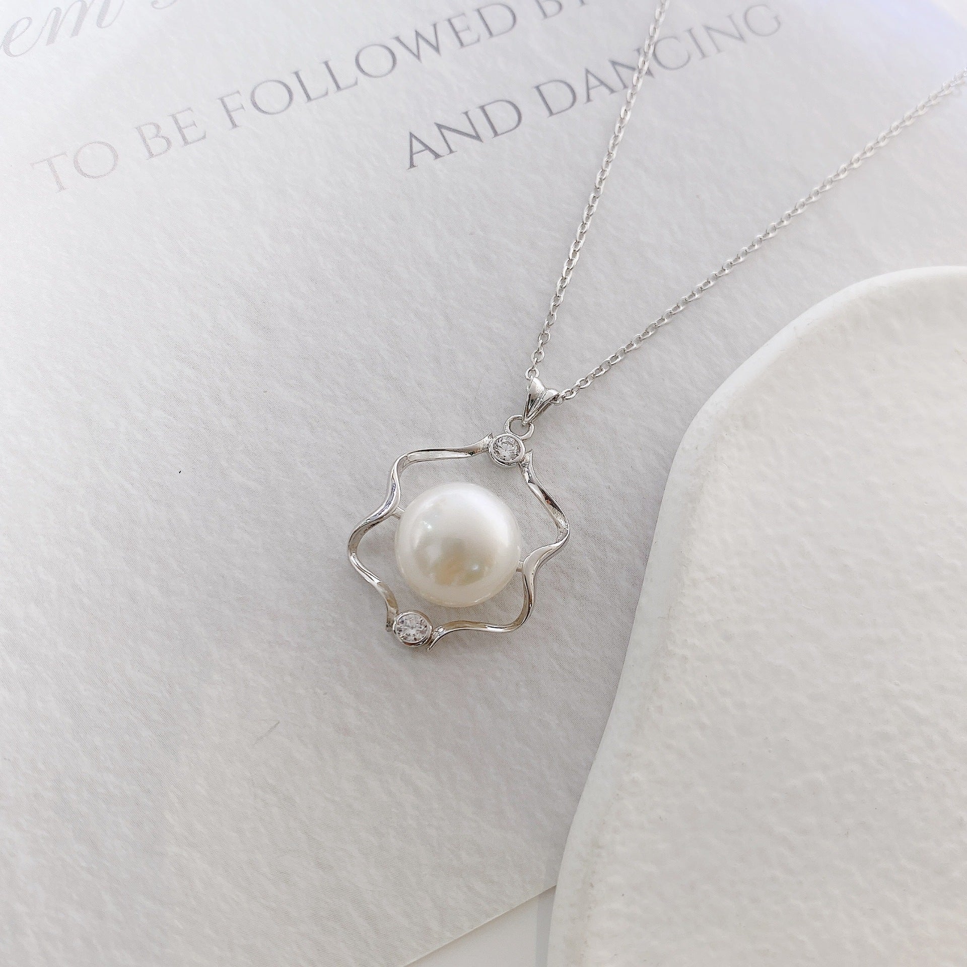Natural Pearl Hollow Geometric Shape Pendant Silver Necklace for Women