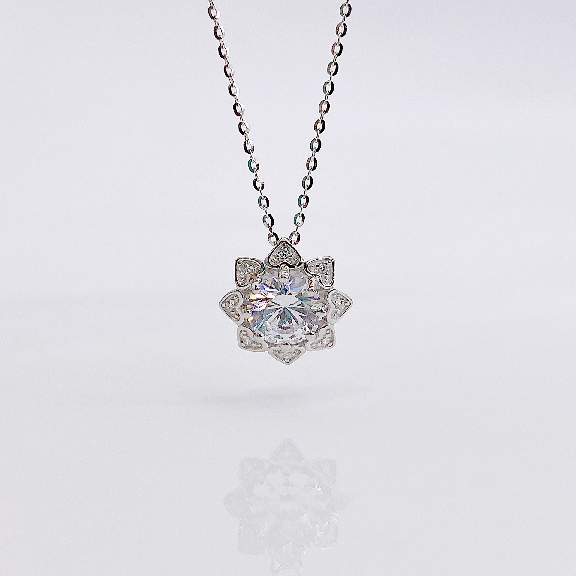This Round Zircon Heart-shape Petal Pendant Silver Necklace is perfect for any occasion. Expertly crafted with a sparkling round Zircon pendant surrounded by delicate zircon heart-shaped petals, it is an elegant and timeless piece of jewelry.