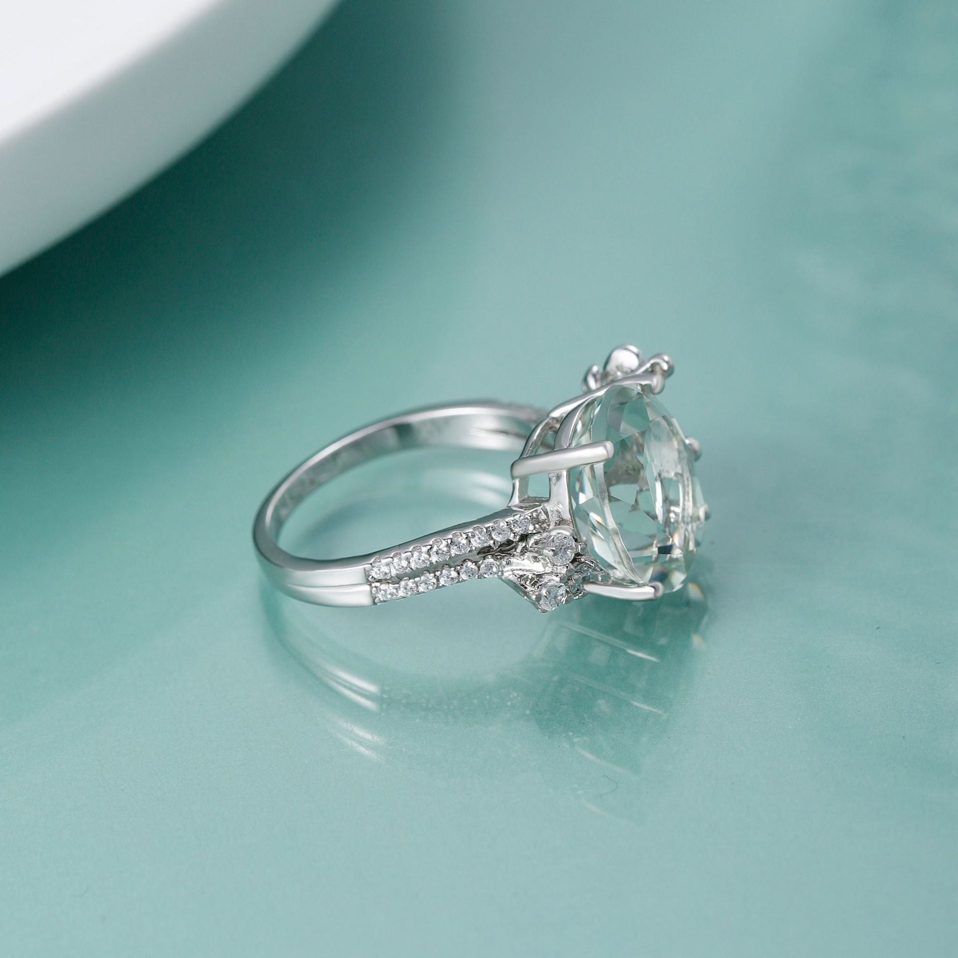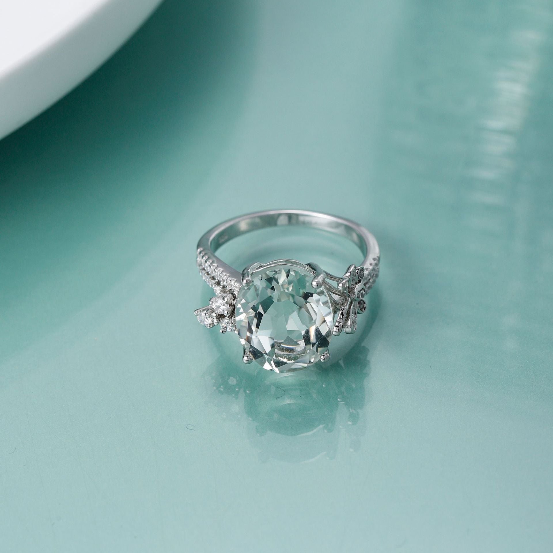 This beautiful personalised design solitaire silver ring, crafted from a natural oval cut green crystal, is sure to be a treasured addition to your jewellery collection. With intricate beautiful patterns and sparkling zircon detailing on the ring arm, the craftsmanship and quality make this ring truly special.