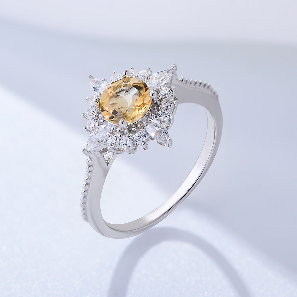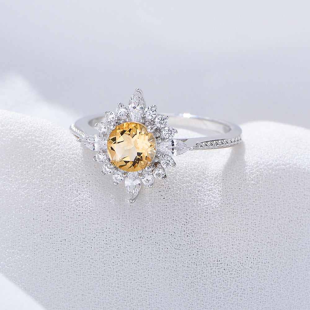 Yellow Crystal Sun Shape Halo Sterling Silver Ring