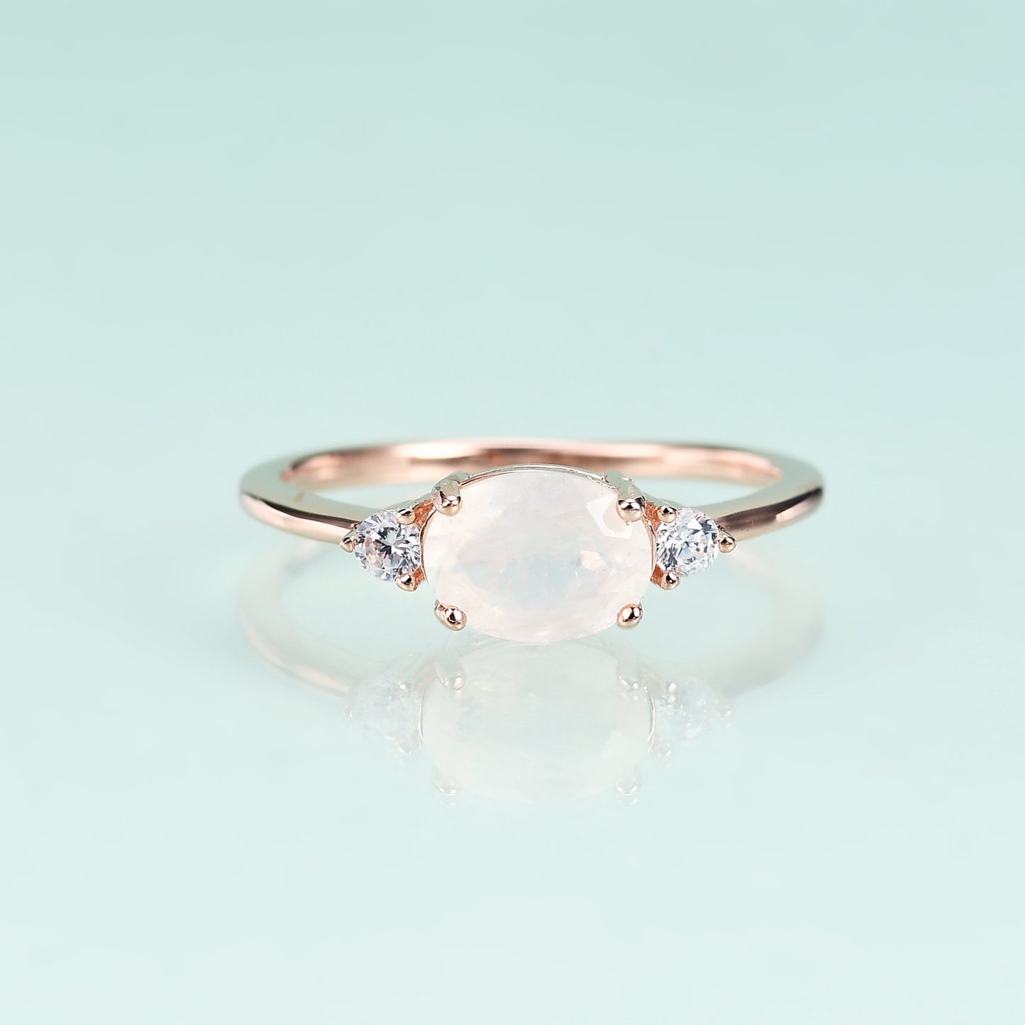 This beautiful 6*8mm oval natural moonstone ring is a timeless addition to any jewelry collection. It is decorated with two sparkling small Zircon stones on the ring arm for a hint of elegant sparkle. The rose gold plating adds a subtle, polished finish.