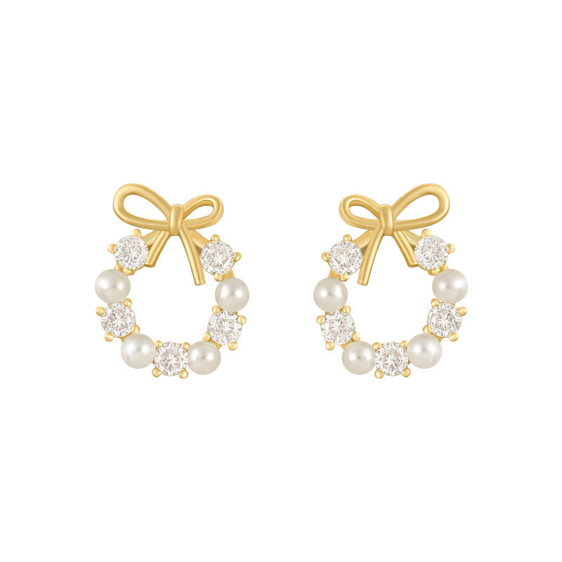 This studs earring is a cute accessory with a garland theme, cleverly combining pearls and bows to create a fresh and sweet atmosphere. The garland is made of pearls strung together, symbolizing beauty and elegance, emitting a precious luster. There is a small bow on the garland, which represents happiness and romance, adding a lovely atmosphere. Gold plated silver earrings represent nobility and luxury, shining with a magnificent light.