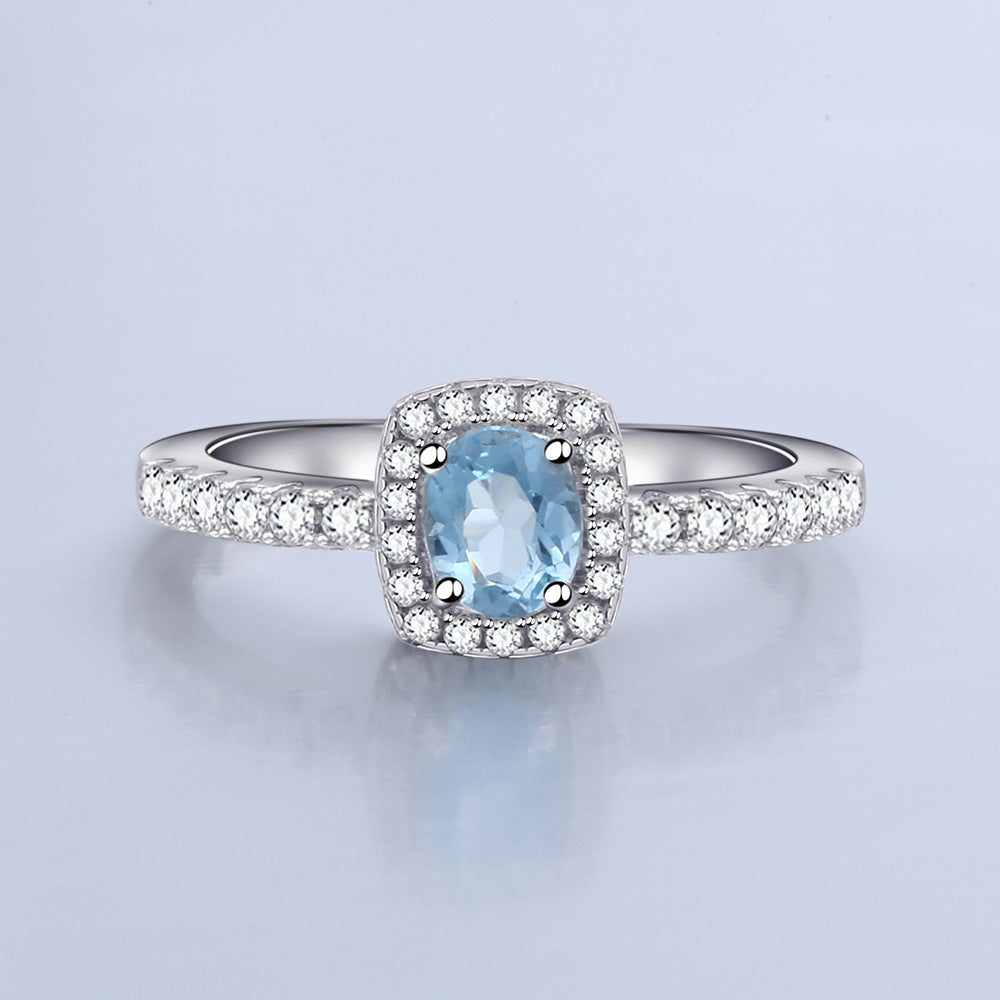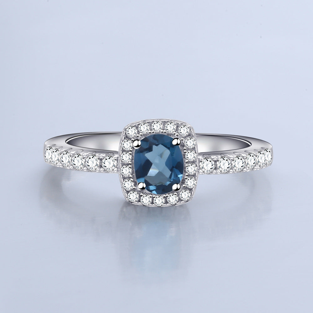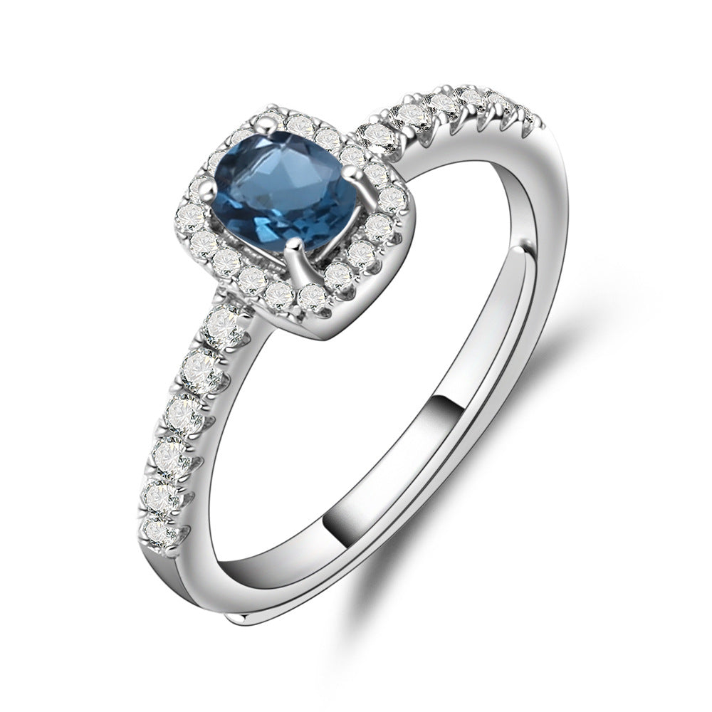 This Adjustable Opening Design Natural Topaz Soleste Halo Sterling Silver Ring for Women is an exquisite piece of jewelry featuring an oval Natural blue Topaz center encircled by a rectangle Soleste Halo. Its ring arm is decorated with small zircons, creating a unique, feminine look. The adjustable opening design makes it a perfect fit for any finger size.