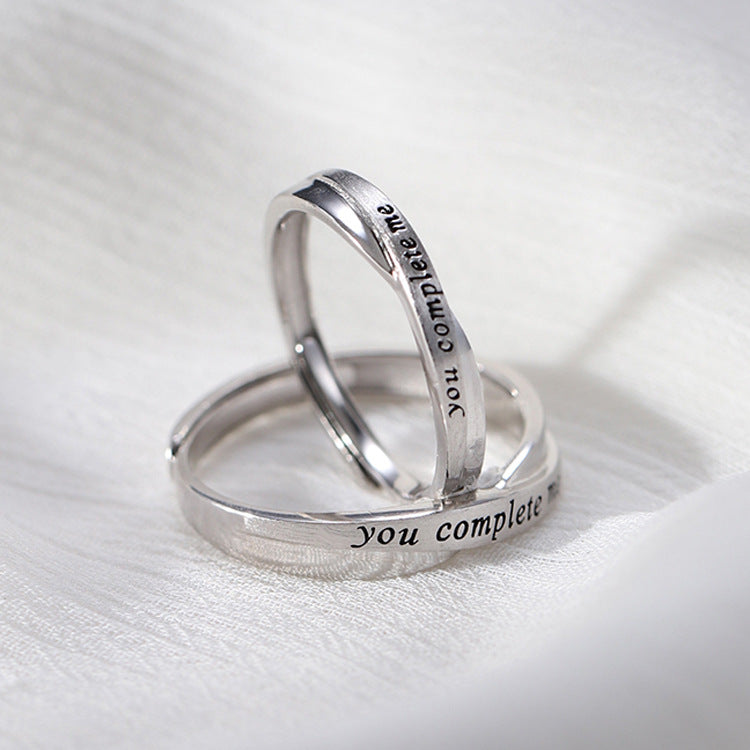 This You Complete Me Silver Couple Ring makes a unique gift for a special someone. Crafted from sterling silver with wire drawing craft, it has a romantic pattern of "You Complete Me" letters that shows your love. Perfect for celebrating an anniversary or expressing love any time of year.