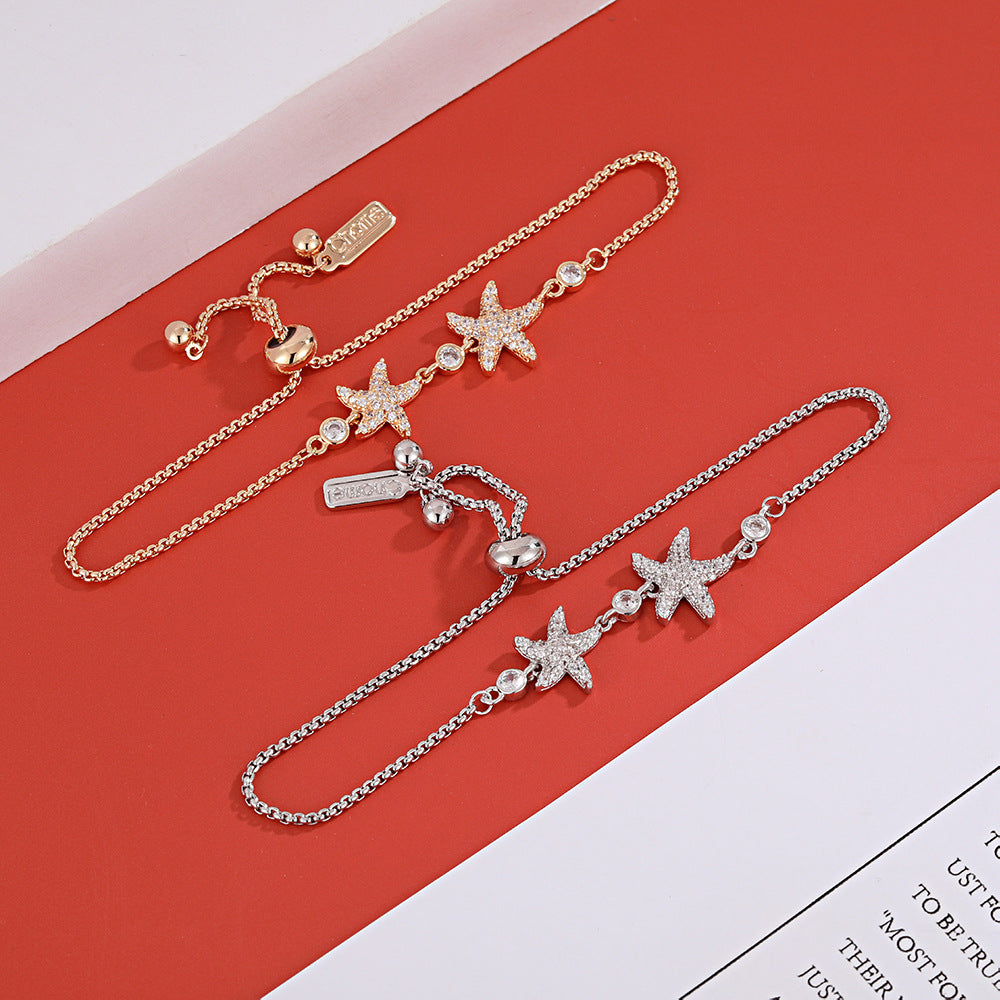 This beautiful Double Starfish with Zircon Silver Bracelet for Women is perfect for any occasion. Showcasing double starfish with sparkling Zirconium stones, it adds an elegant touch to any outfit. Perfectly crafted with sterling silver plated gold for a luxe finish.