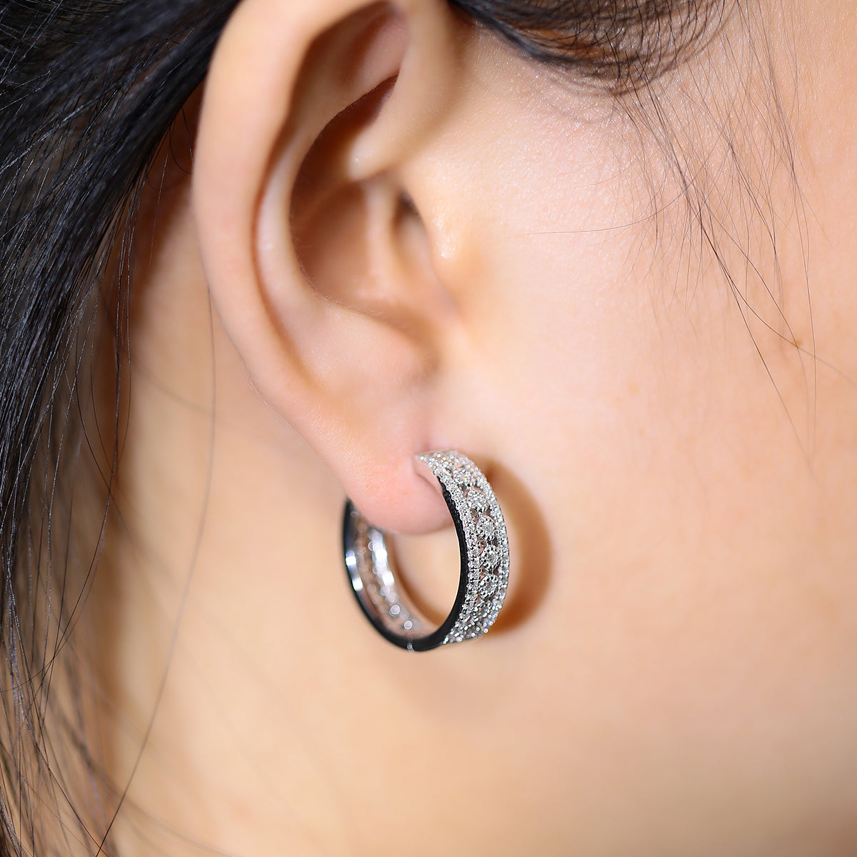 Enjoy a luxe look without compromising on everyday wear. The high-quality moissanite delivers exceptional brilliance that closely resembles diamonds, while the sterling silver setting provides durability and a comfortable feel. The three-row design reflects light from multiple angles for a consistently radiant glow, making these hoops versatile for work, weekends, or special occasions.